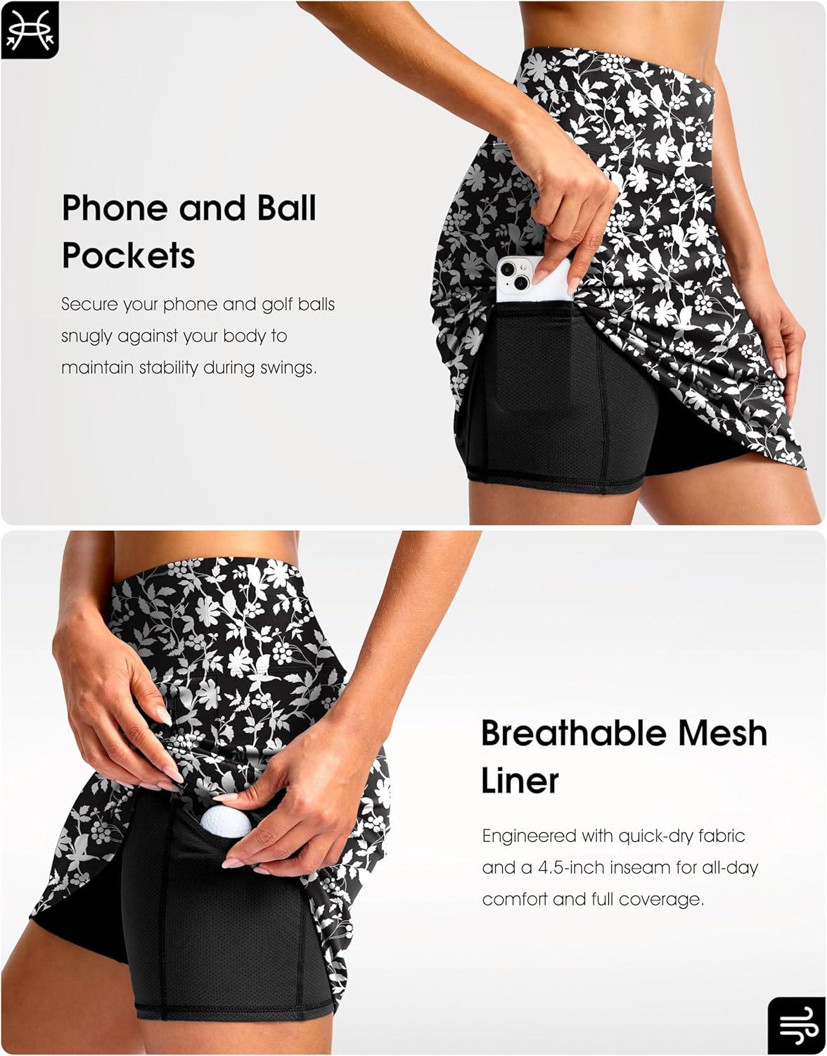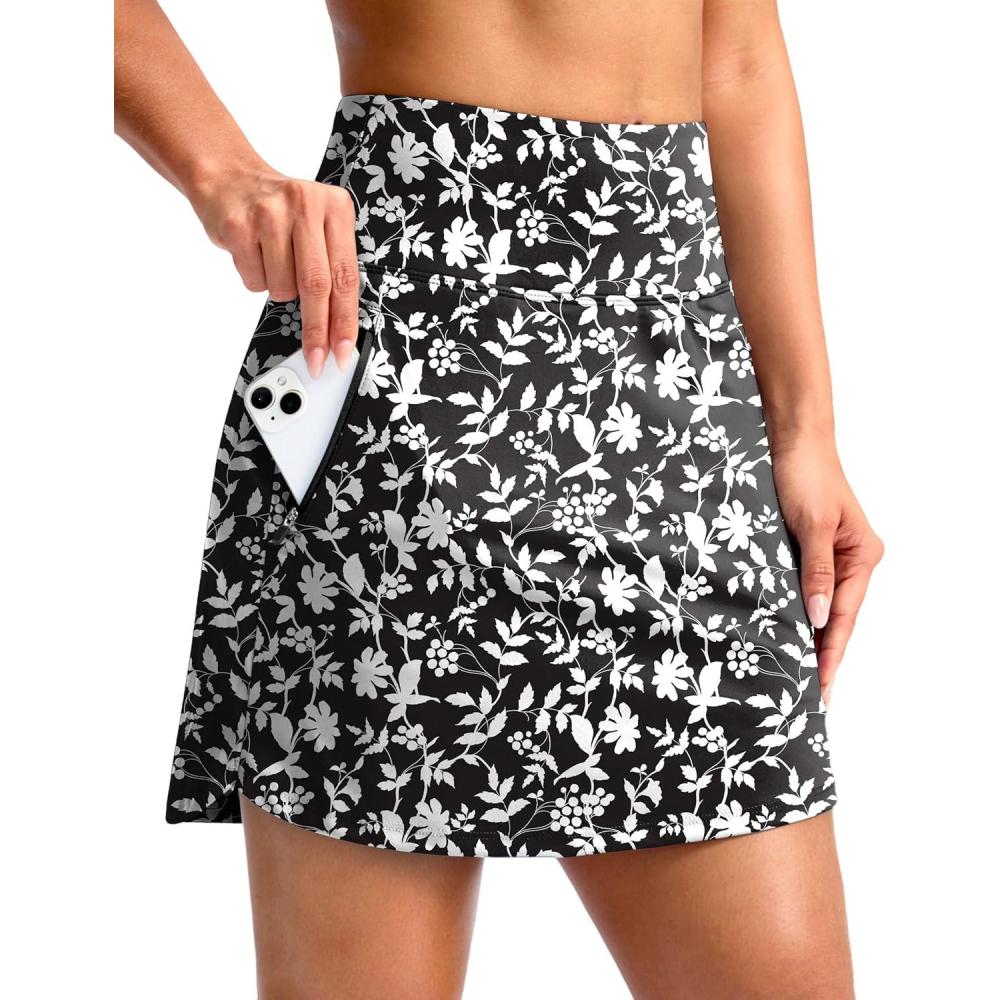 G Gradual 18″ Golf Skirts for Women Zipper Pockets Knee Length Skort with Shorts Underneath High Waist Tennis Pickleball(Black Flower)