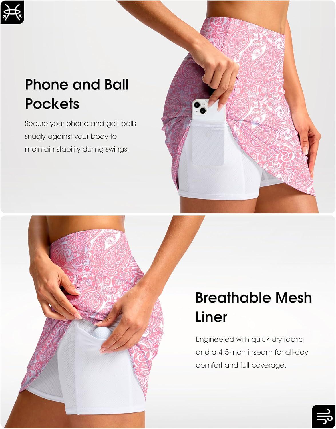G Gradual 18" Golf Skirts for Women Zipper Pockets Knee Length Skort with Shorts Underneath High Waist Tennis Pickleball(Pink Paisley)