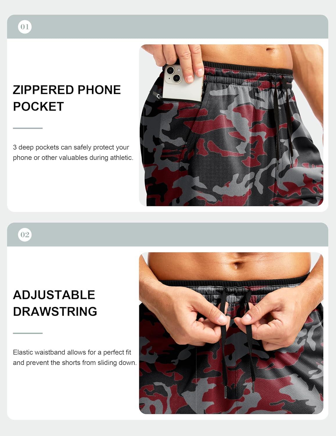 G Gradual Men’s Long Basketball Shorts with Zipper Pocket 11” Quick Dry Gym Shorts Lightweight Mesh Athletic Shorts for Men(Red Camo)