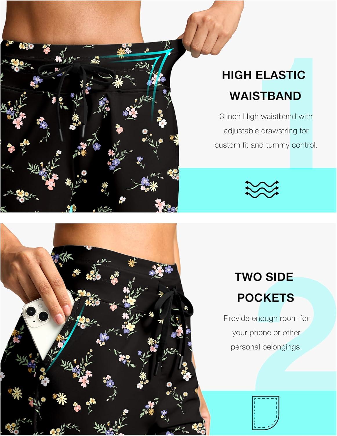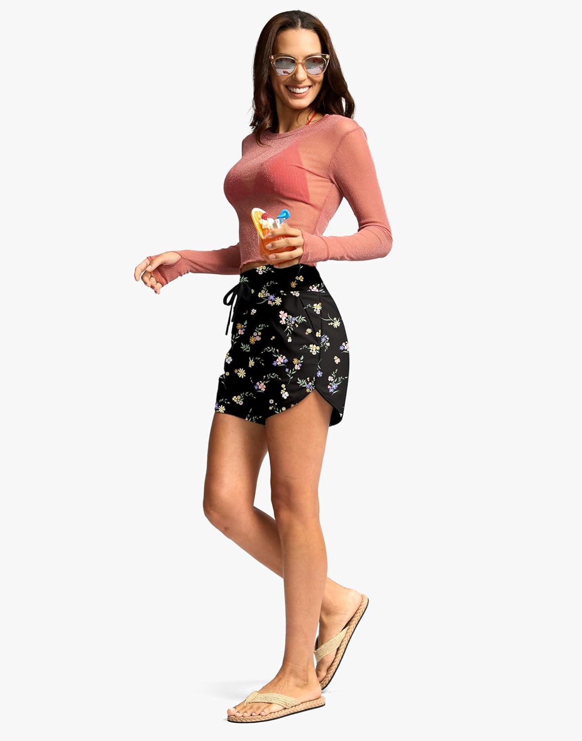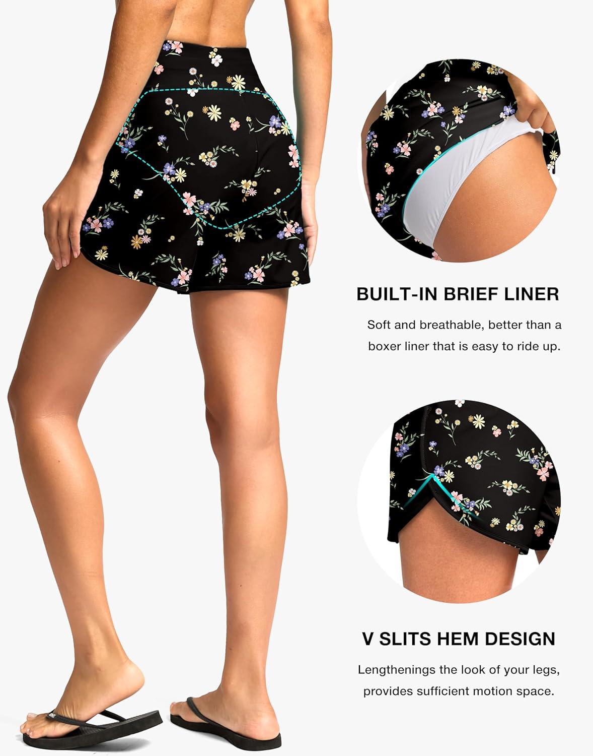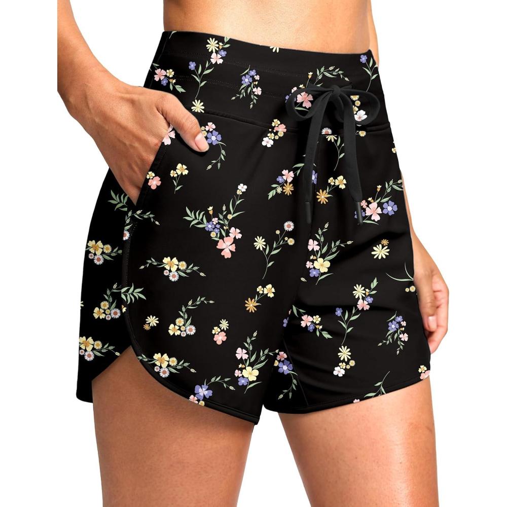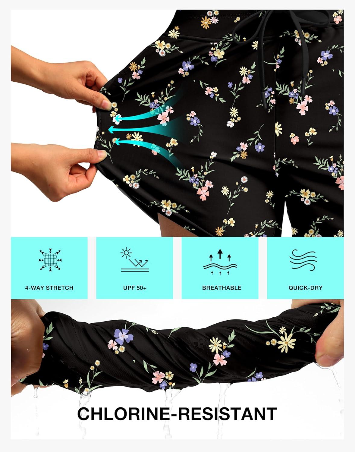 G Gradual Women’s 4” High Waisted Swim Board Shorts Quick Dry Swimming Bathing Suit Bottoms for Women with Pockets Liner(Black Floral)