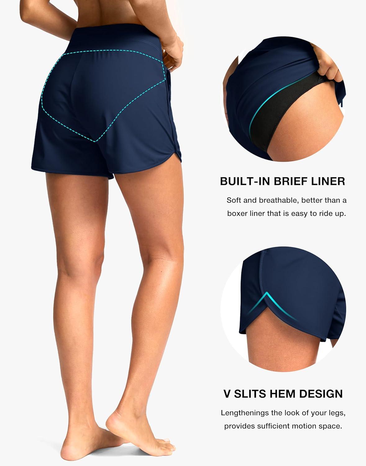 G Gradual Women's 4'' High Waisted Swim Board Shorts Quick Dry Swimming Bathing Suit Bottoms for Women with Pockets Liner(Dark Blue)