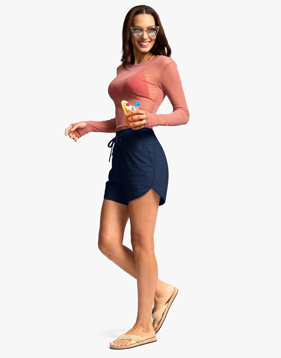 G Gradual Women’s 4” High Waisted Swim Board Shorts Quick Dry Swimming Bathing Suit Bottoms for Women with Pockets Liner(Dark Blue)