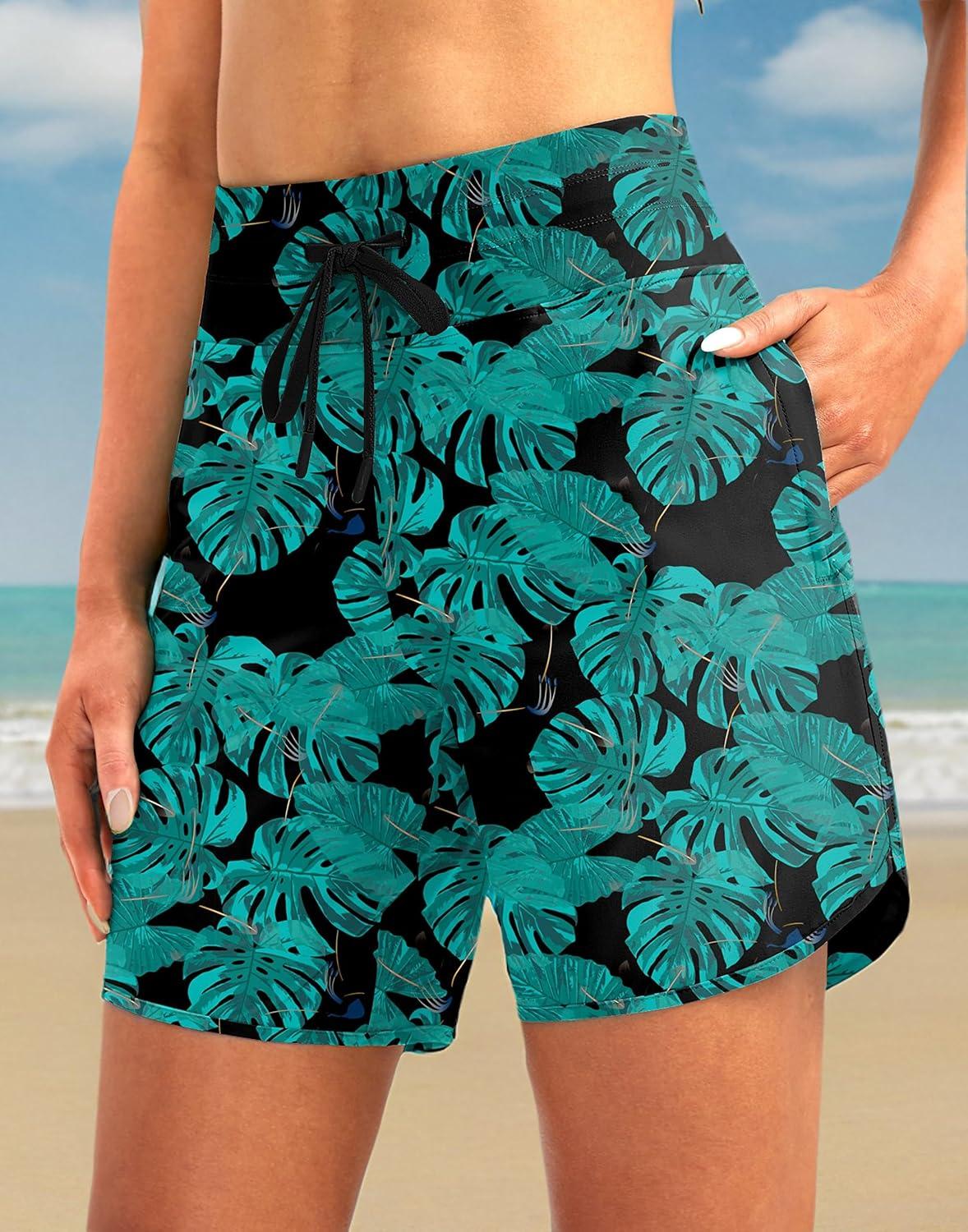 G Gradual Women's 7" Quick Dry High Waisted Swim Board Shorts with Zipper Pockets UPF 50+ Beach Shorts for Women with Liner(Leaf)