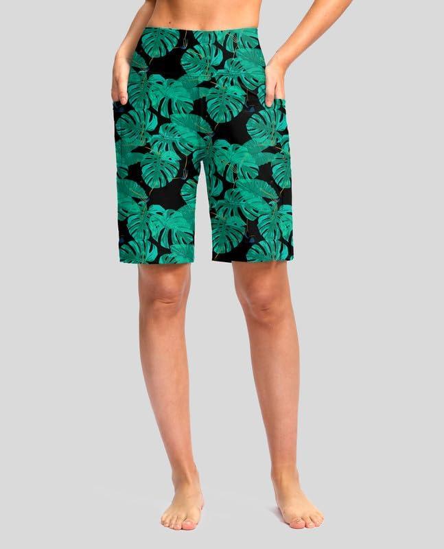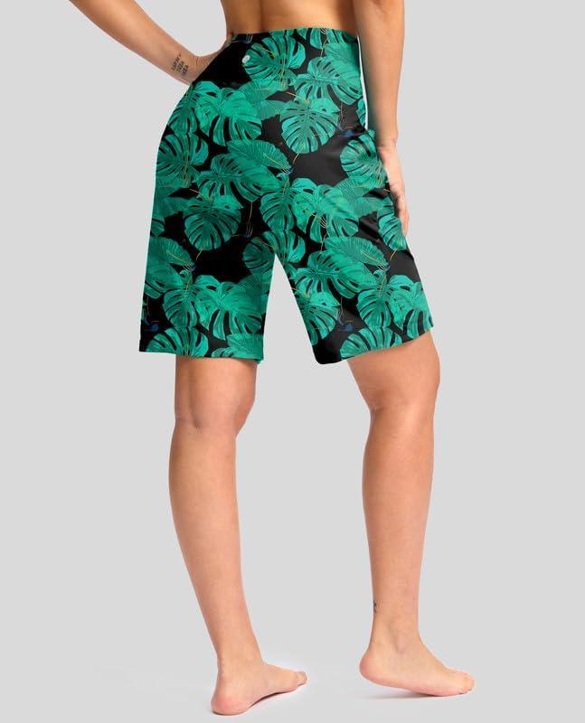 G Gradual Women's 9" Long Swim Board Shorts with Pockets High Waisted Knee Length Beach Swimming Shorts for Women with Liner(Leaf)