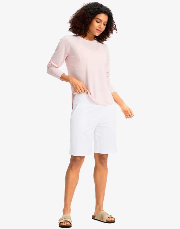 G Gradual Women’s Bermuda Long Shorts with Pockets 9″ High Waisted Knee Length Shorts for Women Walking Athletic Workout(White)