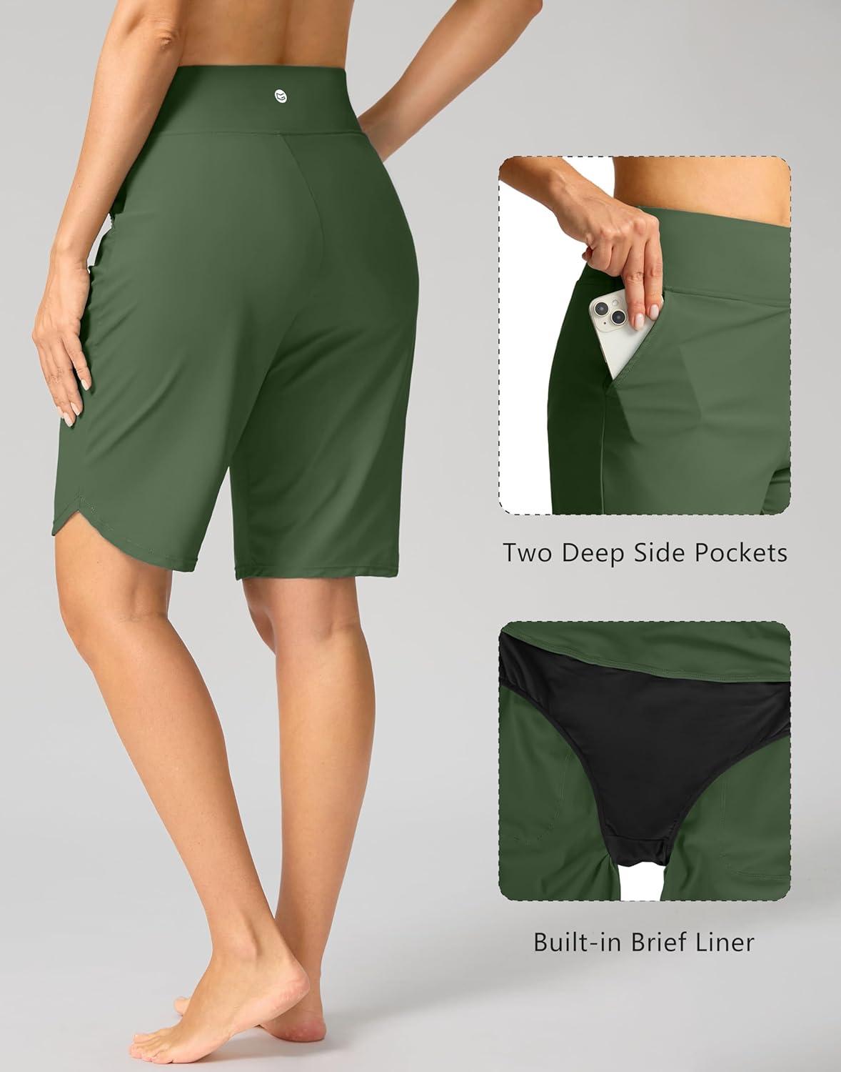 G Gradual Women’s High Waisted Swim Board Shorts 11″ Knee Length Beach Swimming Long Shorts for Women with Pockets Liner(Green)