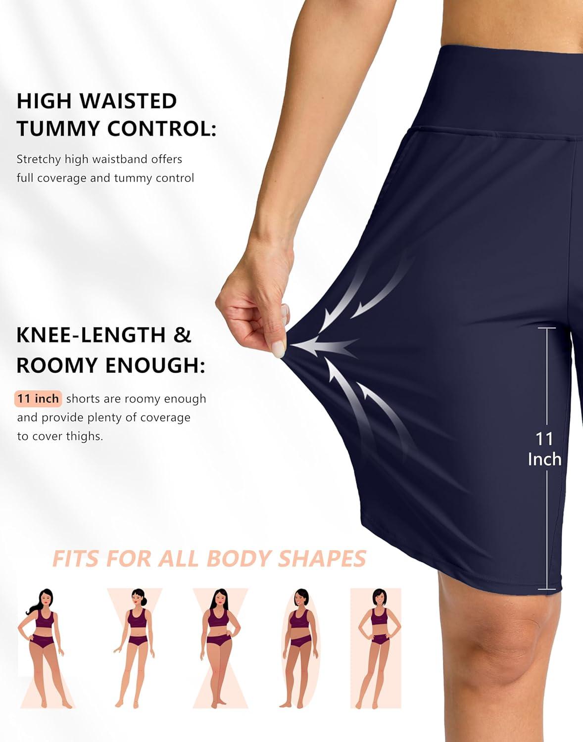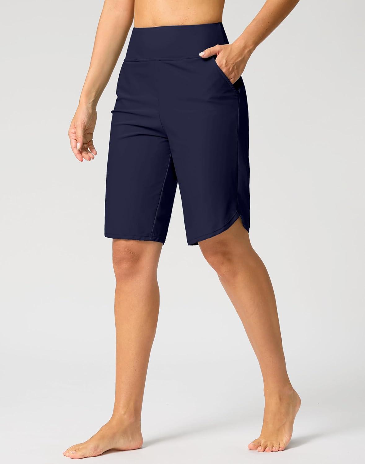 G Gradual Women’s High Waisted Swim Board Shorts 11″ Knee Length Beach Swimming Long Shorts for Women with Pockets Liner(Navy)