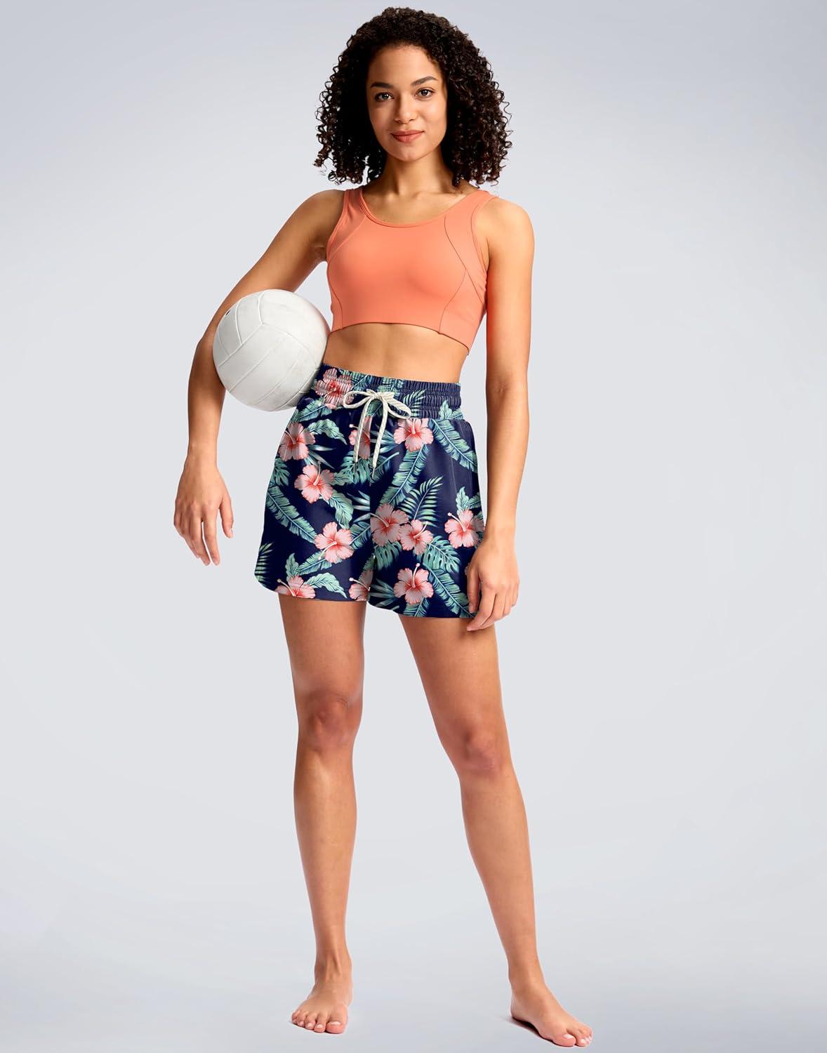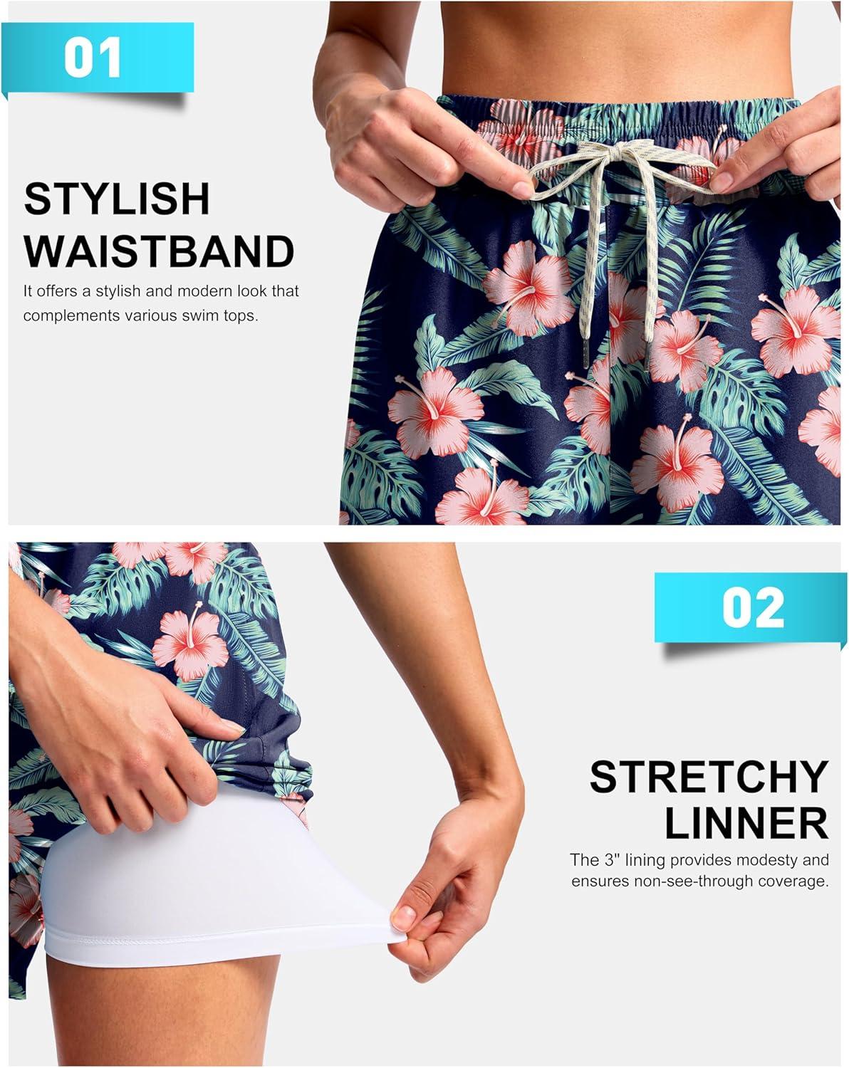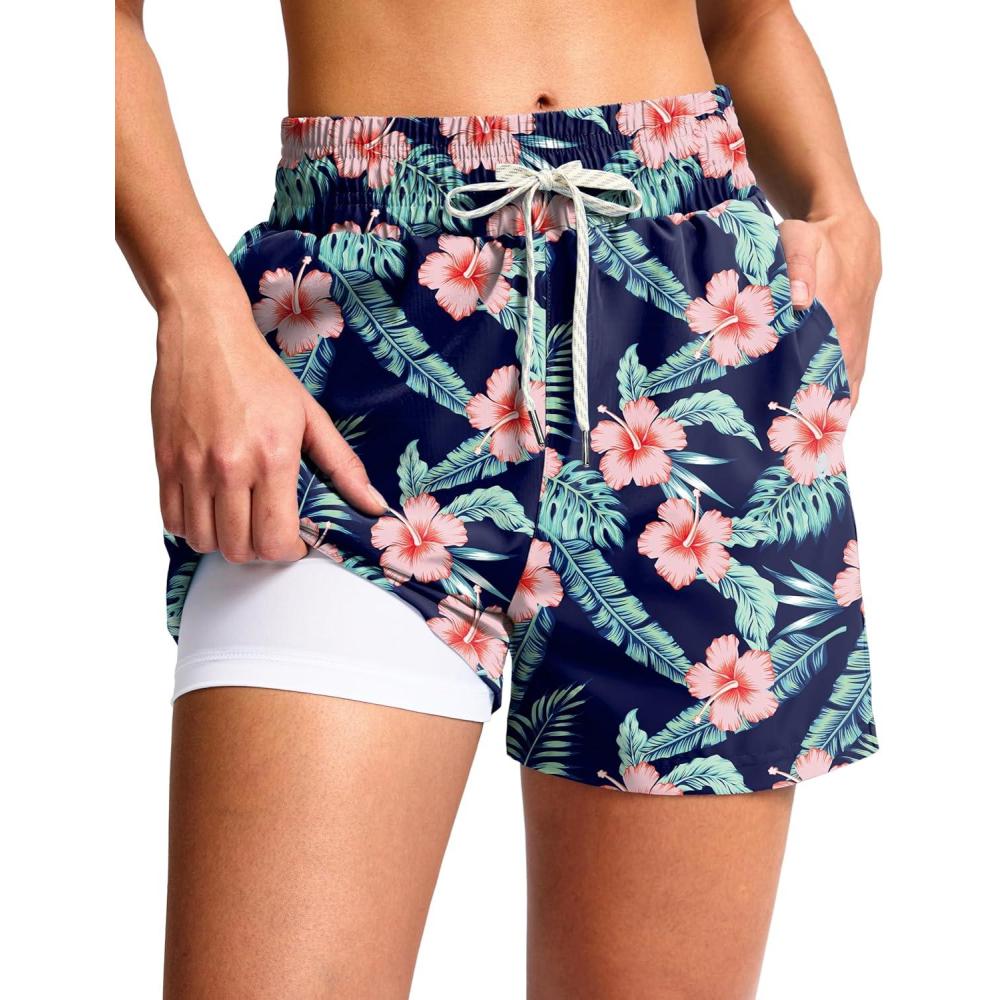 G Gradual Women’s Swim Shorts 4″ Quick Dry Board Shorts with Boxer Liner Deep Pockets Trunks for Water Fun, Beach, Surf, Pool(Navy Flower)