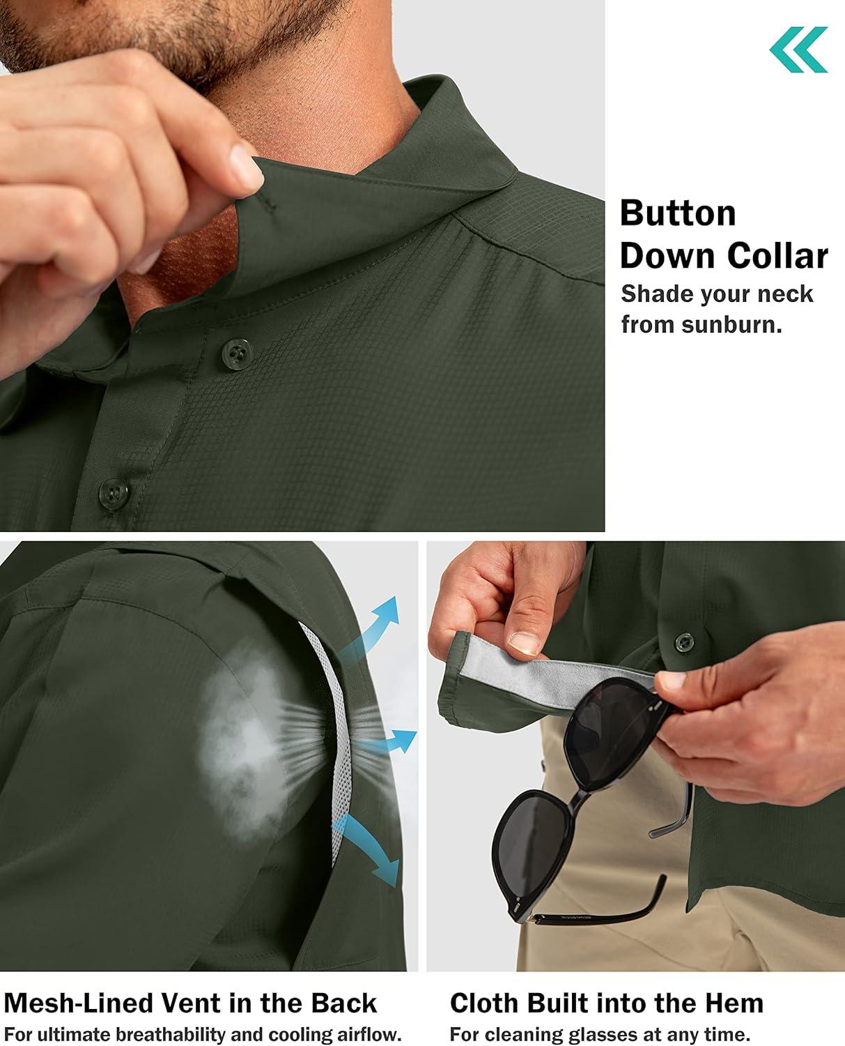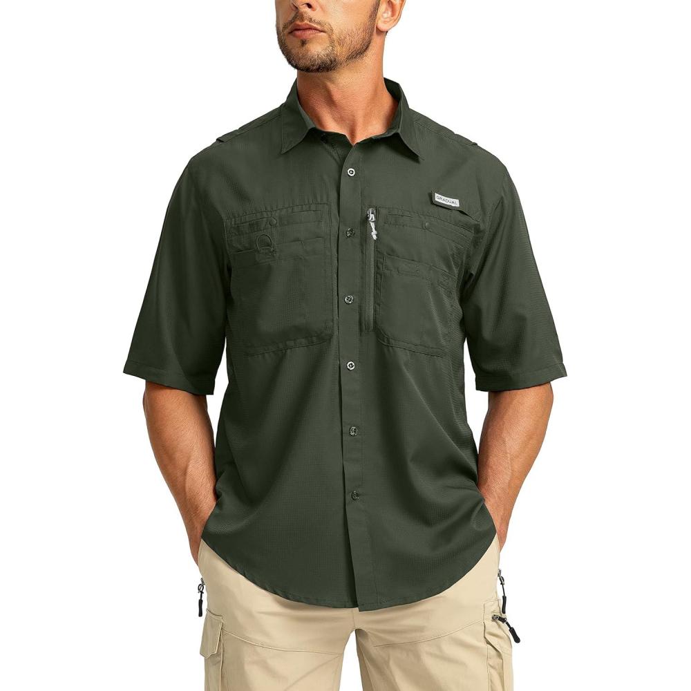 Men's Fishing Shirts with Zipper Pockets UPF 50+ Lightweight Cool Short Sleeve Button Down Shirts for Men Casual Hiking(Olive)