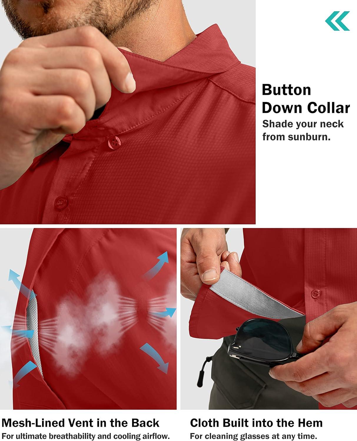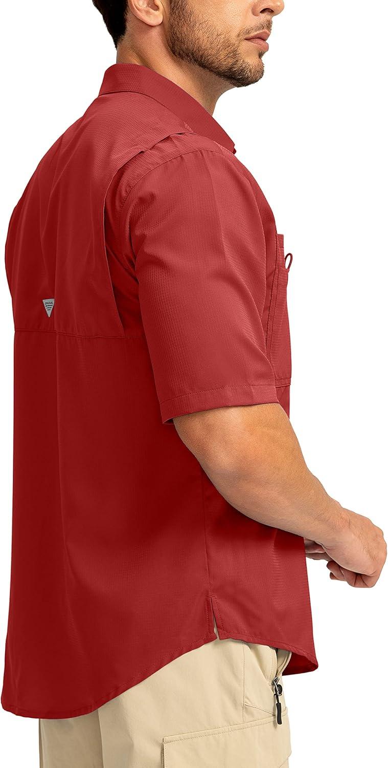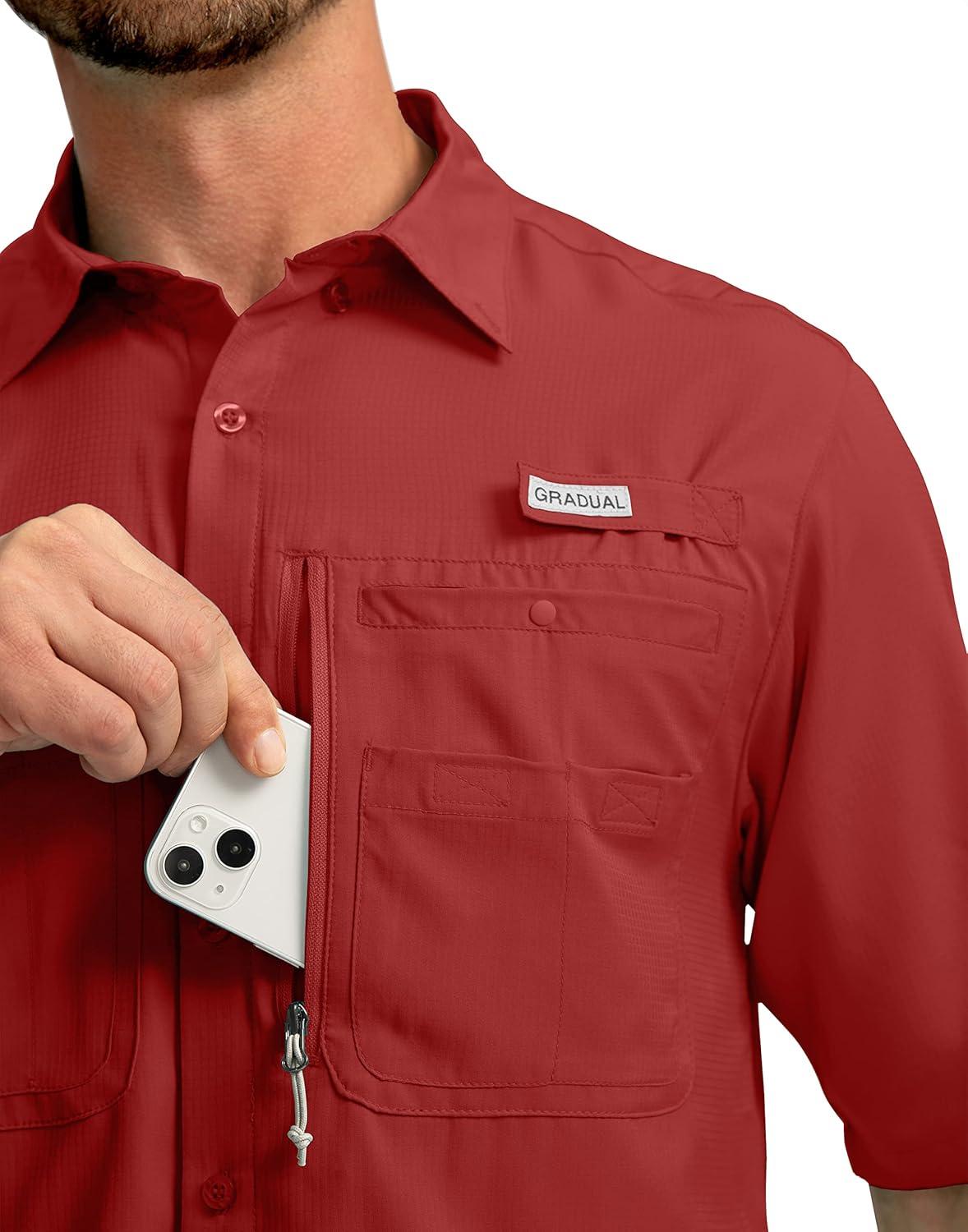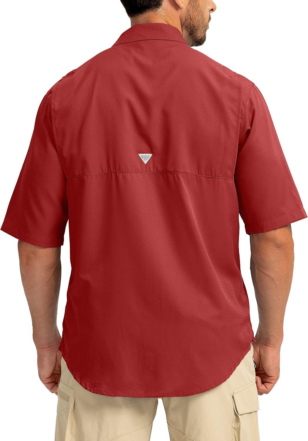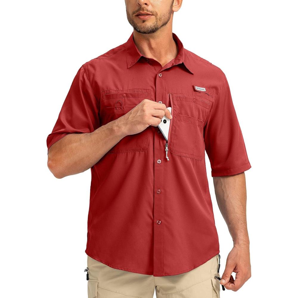 Men's Fishing Shirts with Zipper Pockets UPF 50+ Lightweight Cool Short Sleeve Button Down Shirts for Men Casual Hiking(Red)
