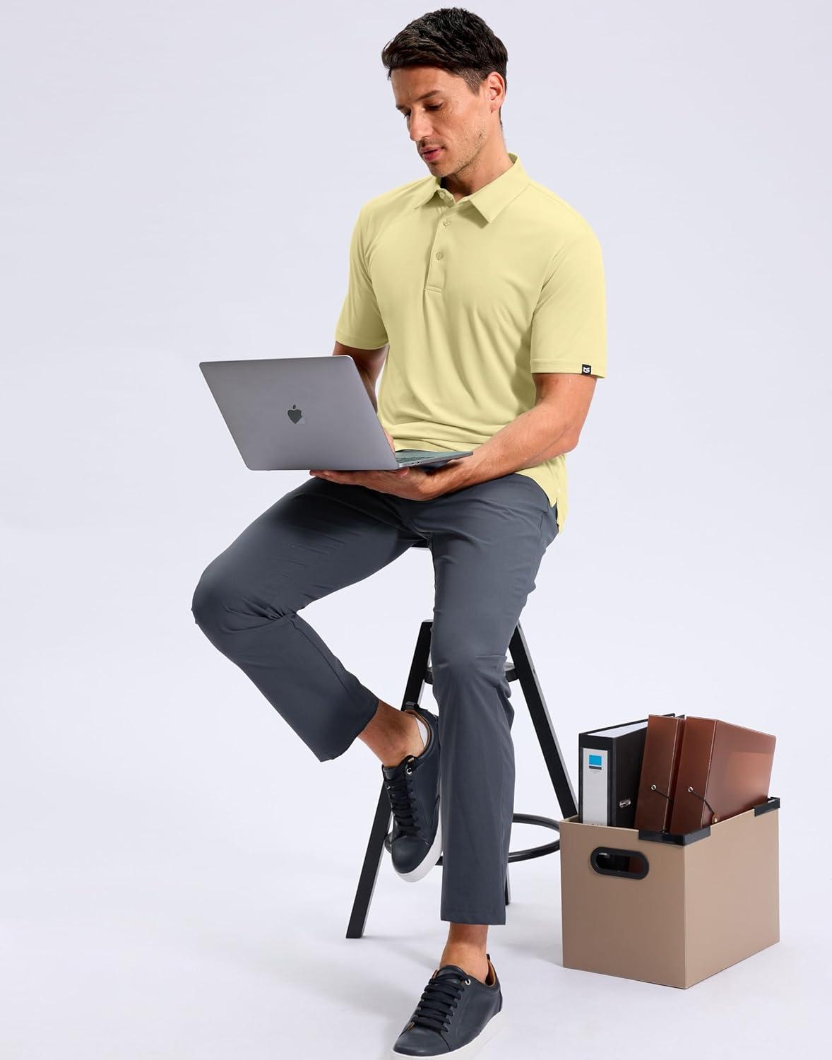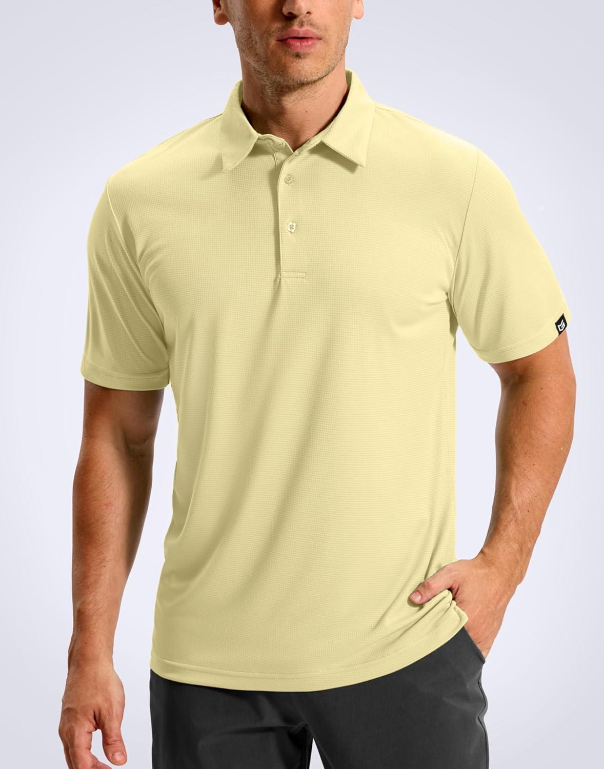 Mens Golf Shirt Jacquard Short Sleeve Dry Fit Moisture Wicking Performance Athletic Summer Collared Polo Shirts for Men(Light Yellow)