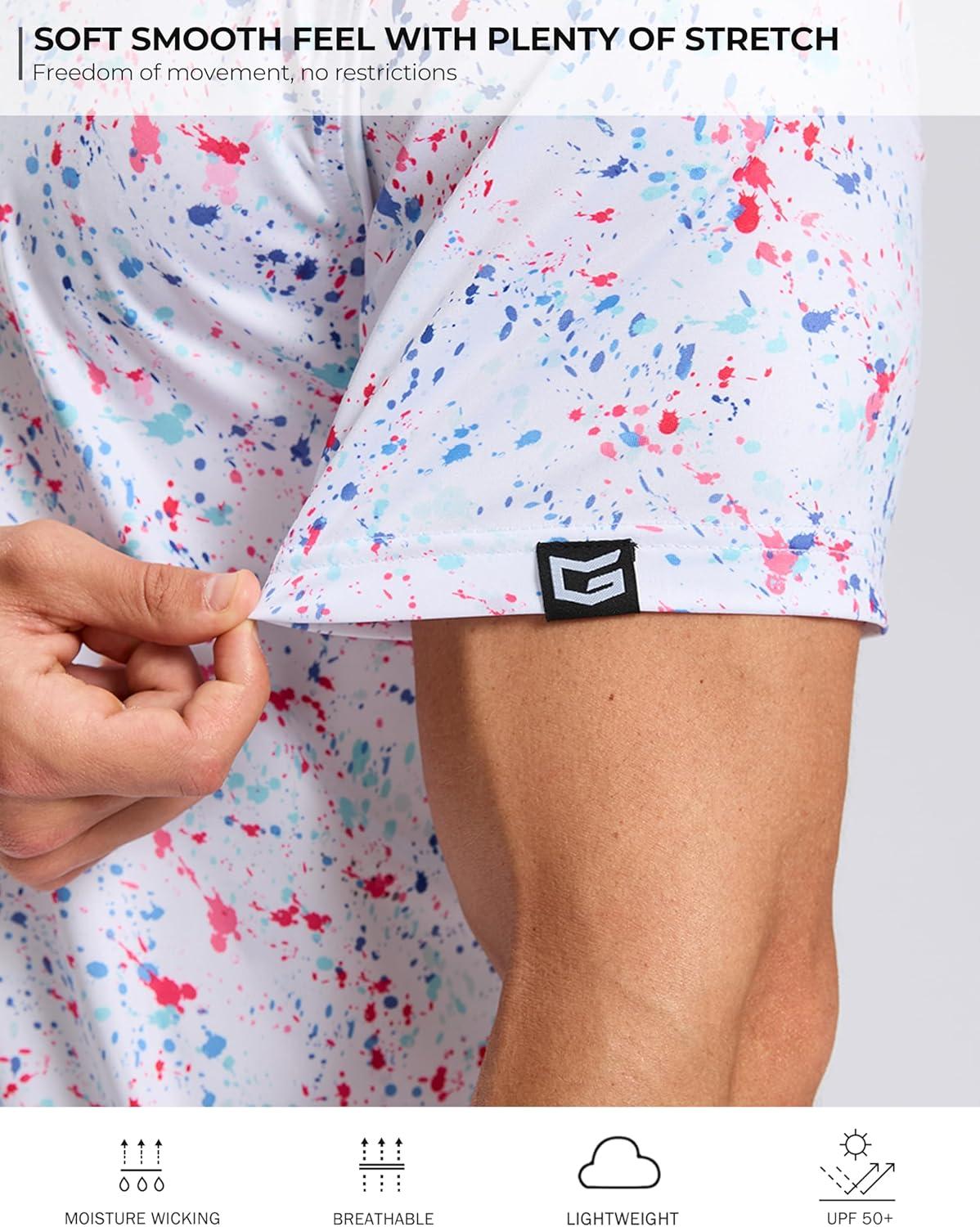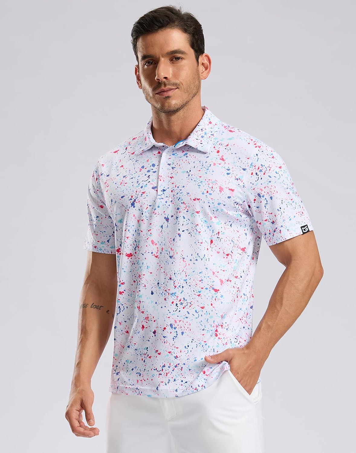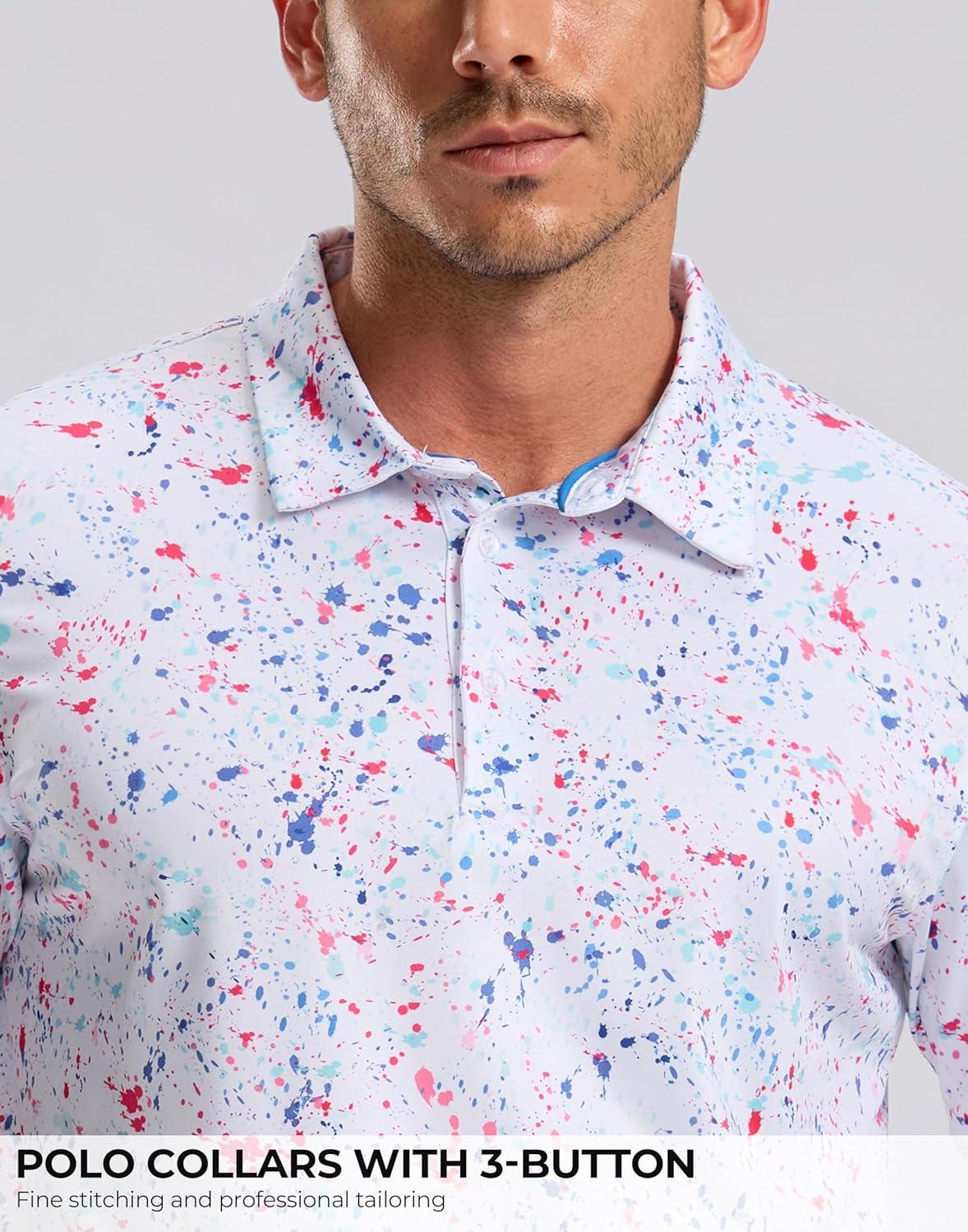 Men’s Golf Shirt Short Sleeve Dry Fit Polo Moisture Wicking Print Collared Golf Shirts for Men Casual Lightweight(White Colored Dots)