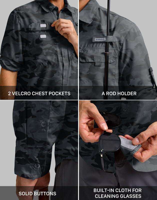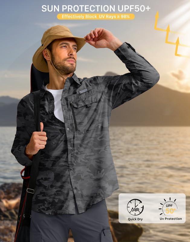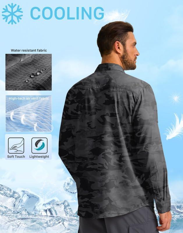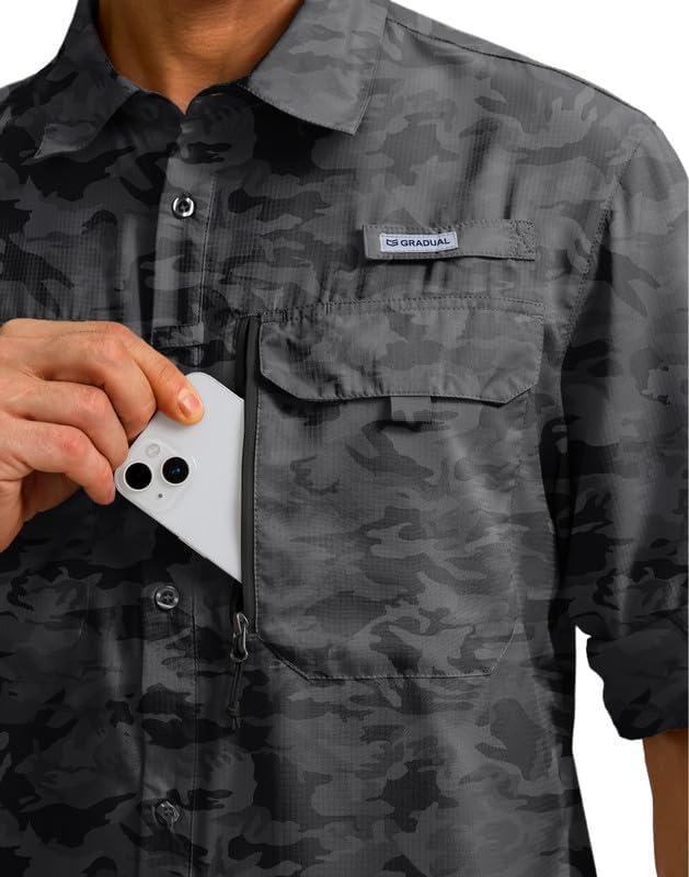 Men's Sun Protection Fishing Shirt with Zipper Pockets Long Sleeve UPF 50+ UV Cooling Shirts for Men Hiking Travel(Grey Camo)