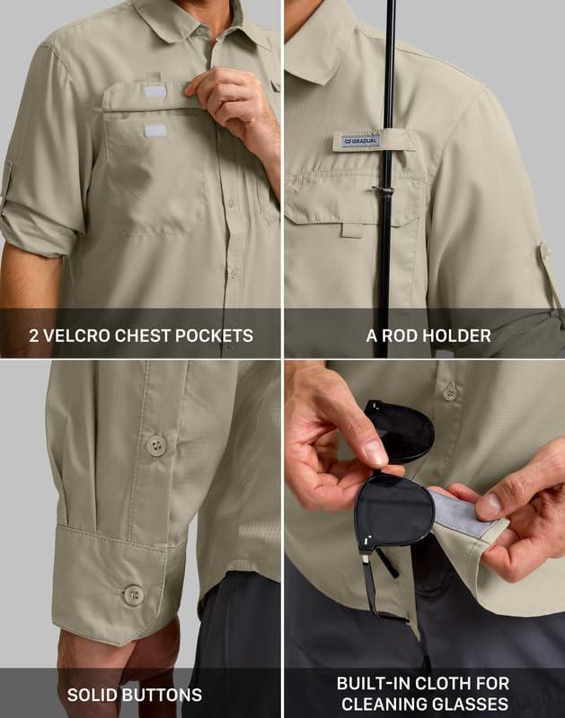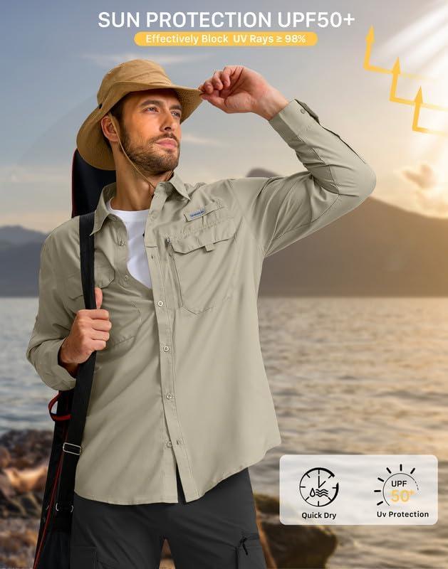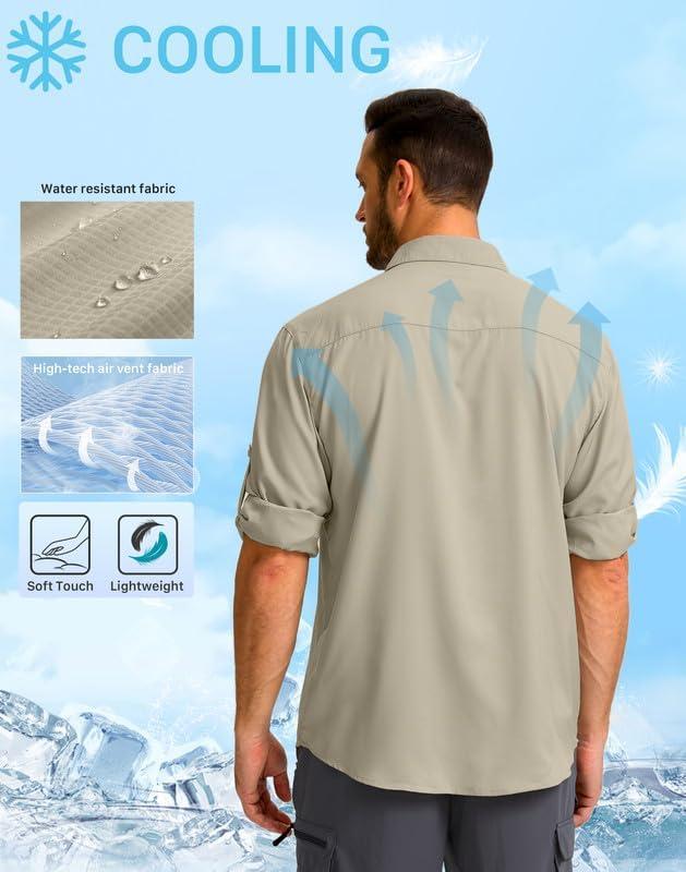 Men's Sun Protection Fishing Shirt with Zipper Pockets Long Sleeve UPF 50+ UV Cooling Shirts for Men Hiking Travel(Khaki)