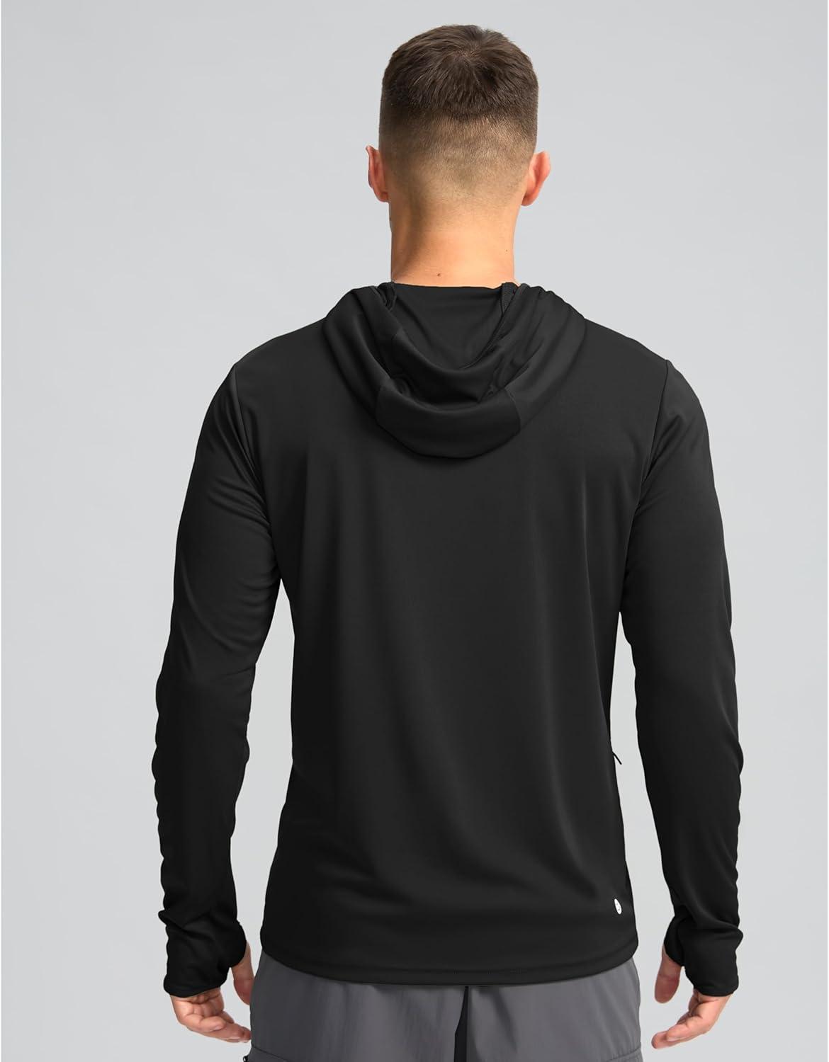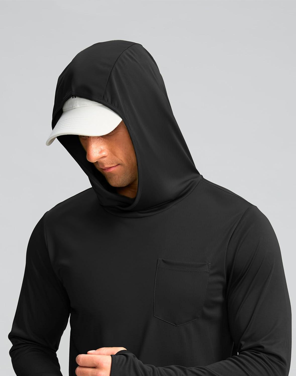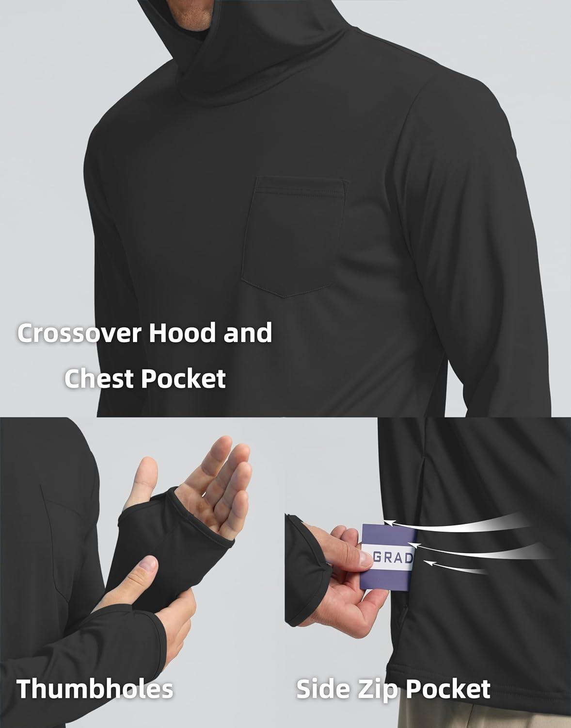 Men’s Sun Protection Shirts UPF 50+ Long Sleeve Hoodie with 2 Pockets UV SPF Fishing Hiking Rash Guard Shirts(Black)