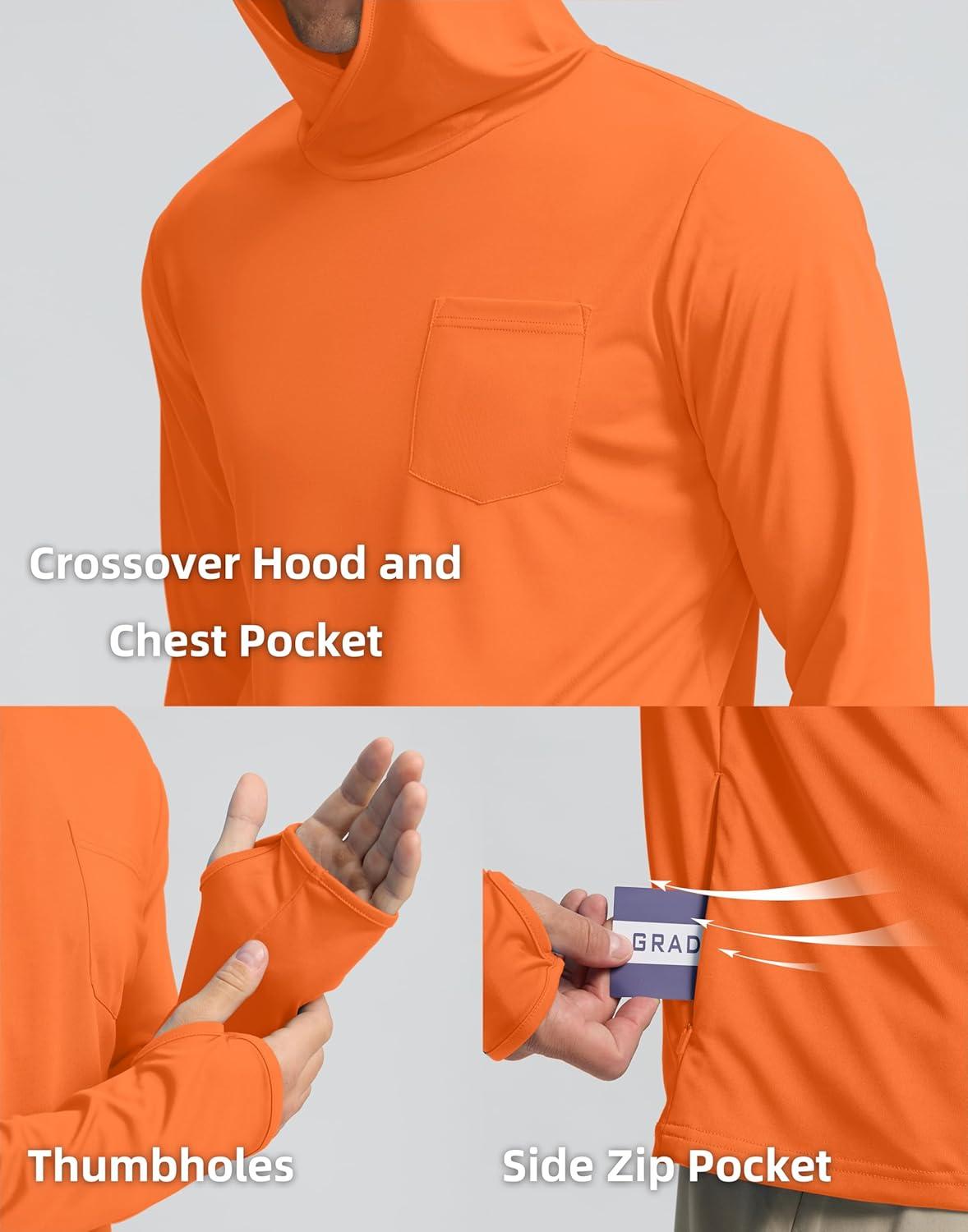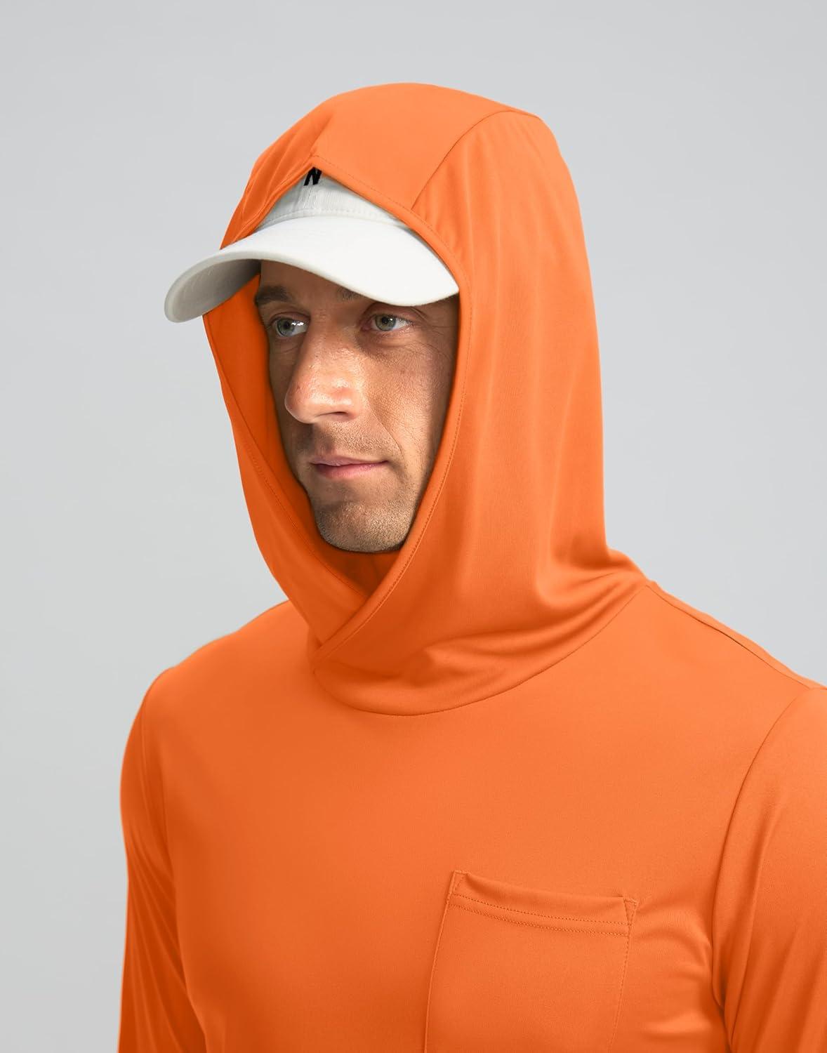 Men’s Sun Protection Shirts UPF 50+ Long Sleeve Hoodie with 2 Pockets UV SPF Fishing Hiking Rash Guard Shirts(Orange)
