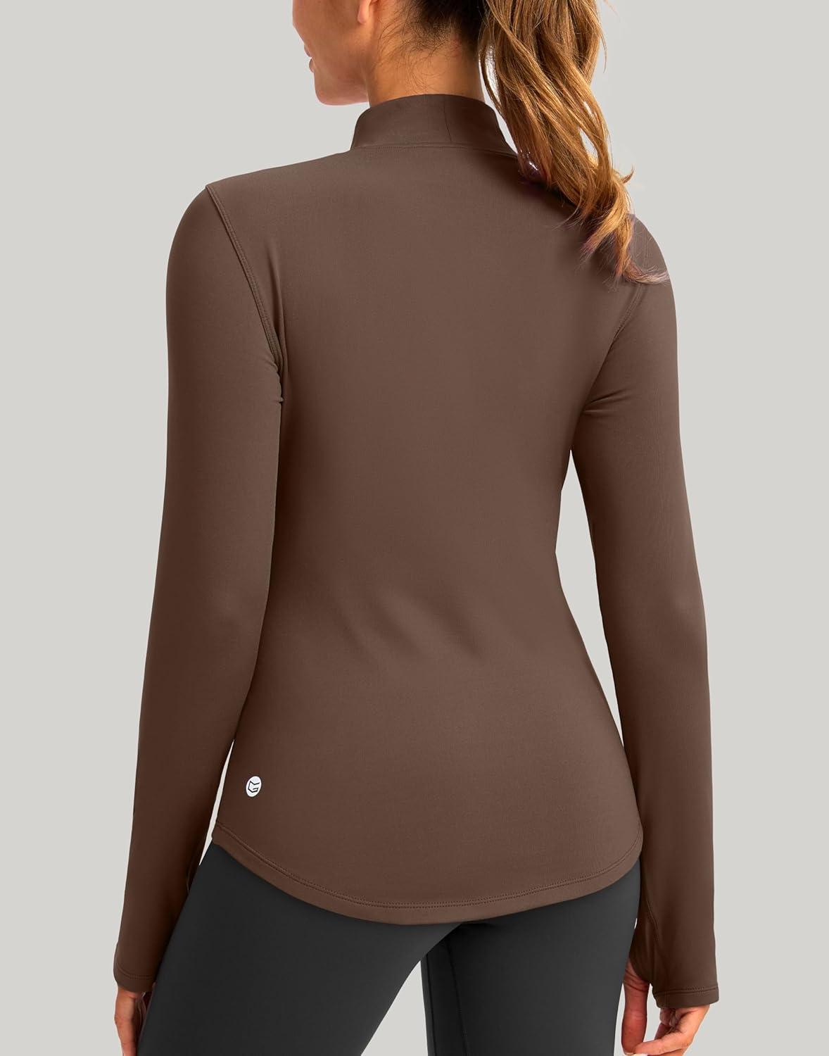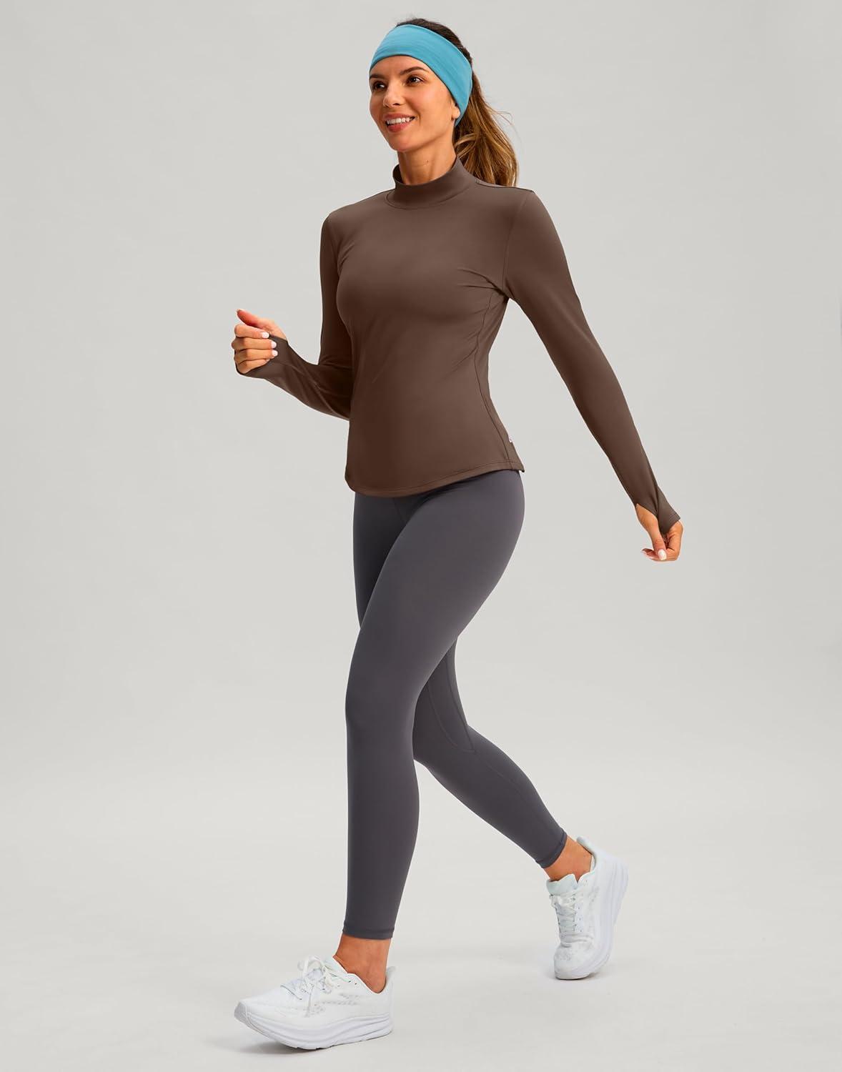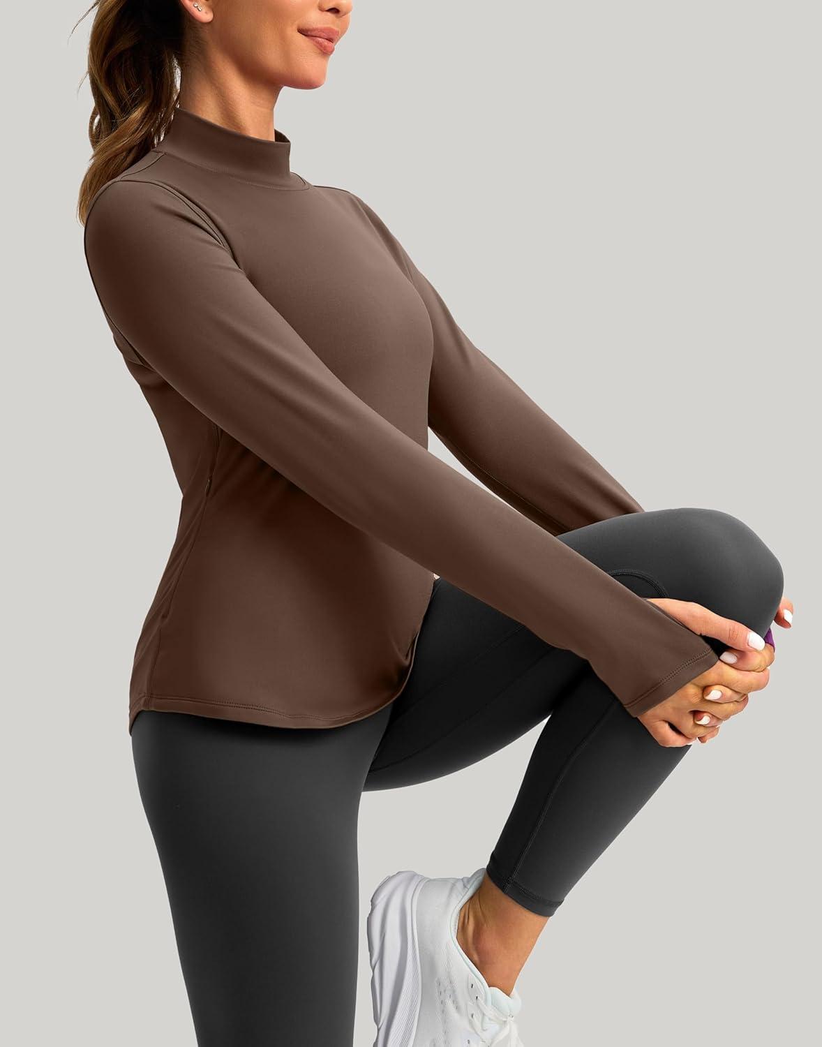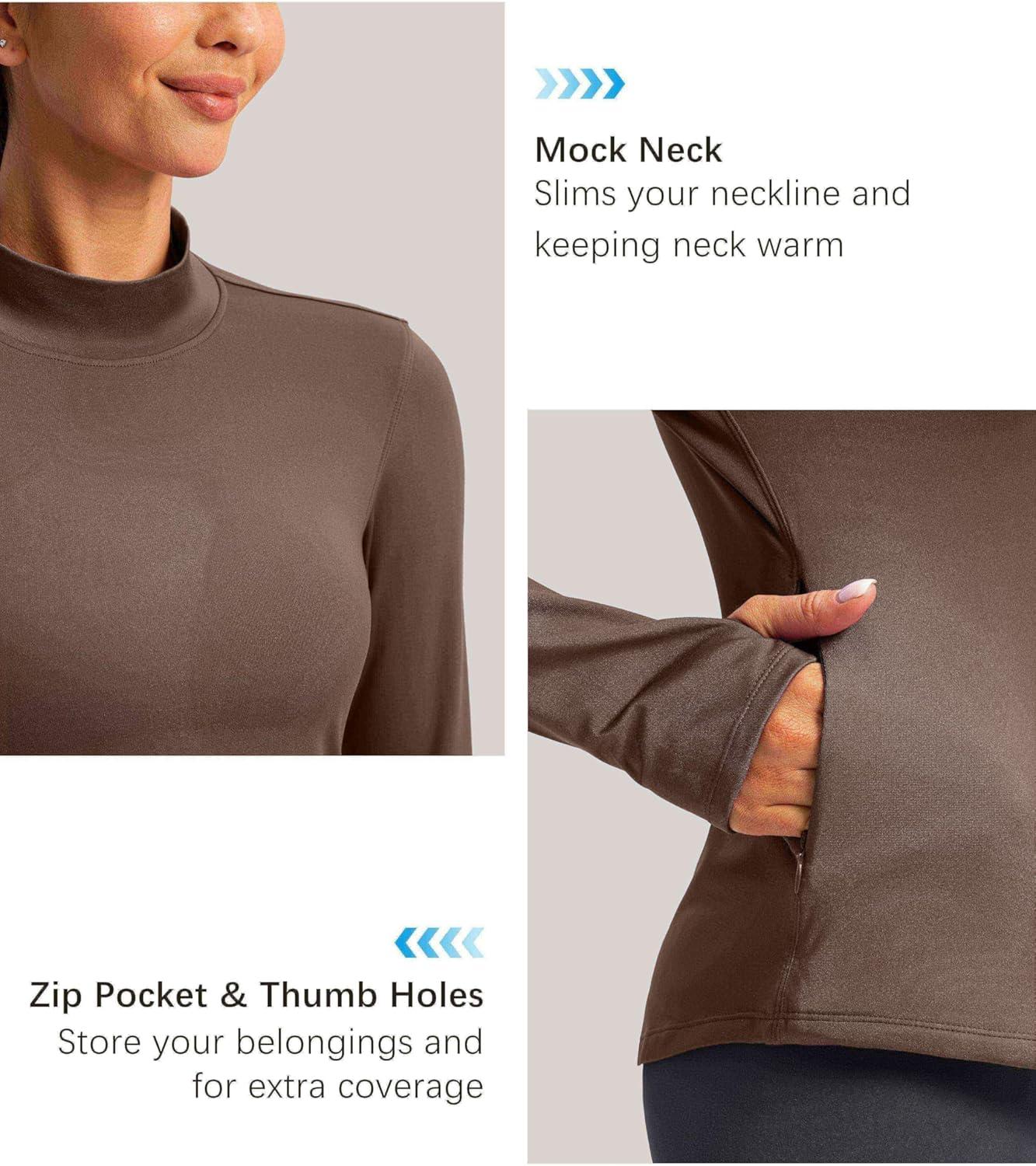 Thermal Shirts for Women Long Sleeve Mock Neck Fleece Tops Running Workout Cold Weather Gear with Zip Pocket(Brown)