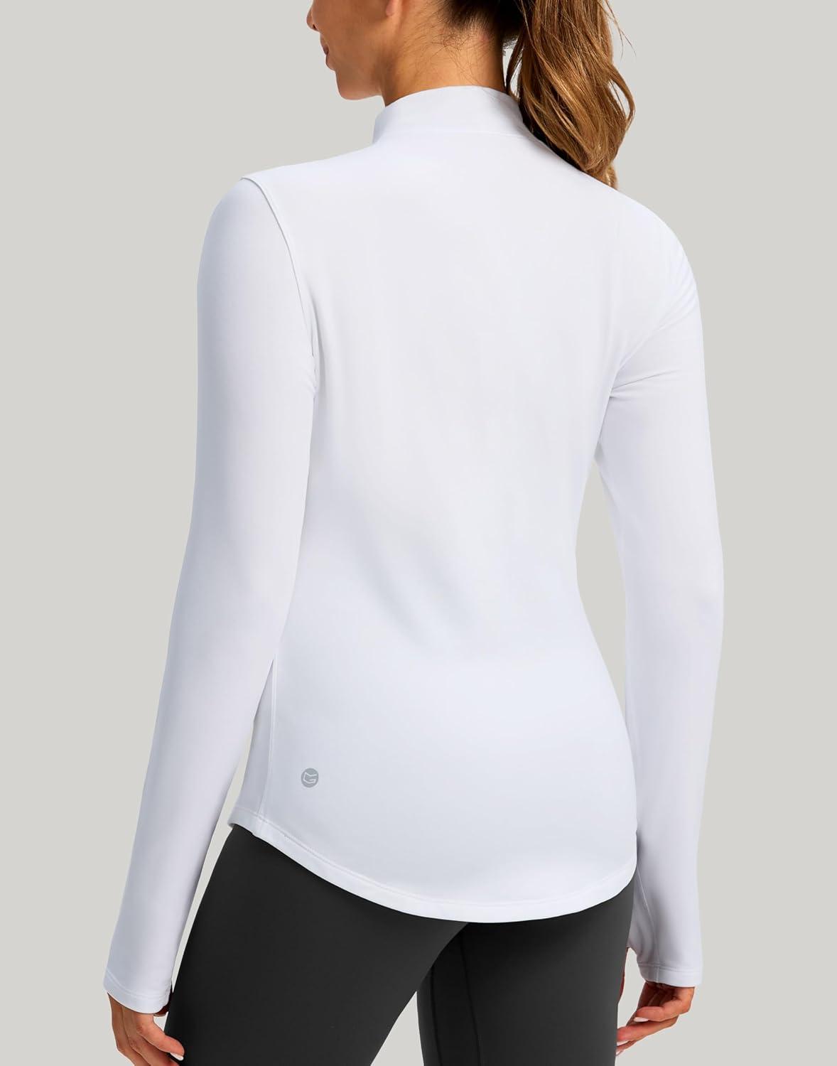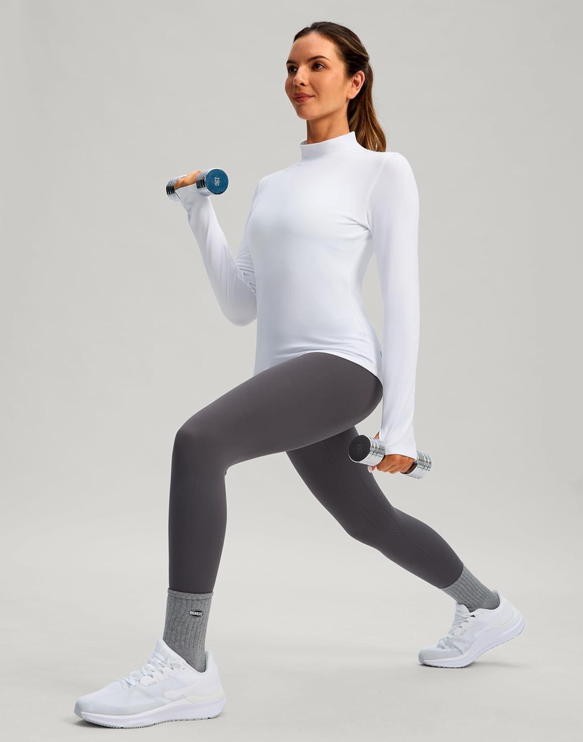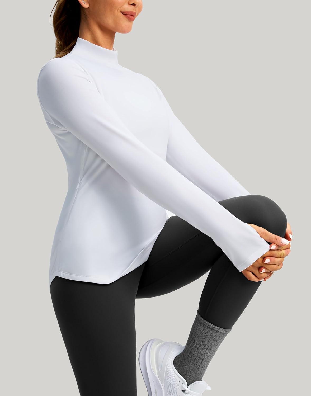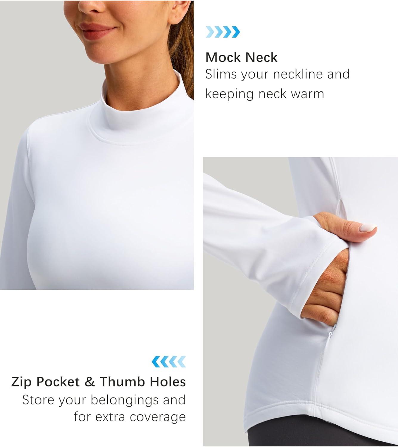 Thermal Shirts for Women Long Sleeve Mock Neck Fleece Tops Running Workout Cold Weather Gear with Zip Pocket(White)