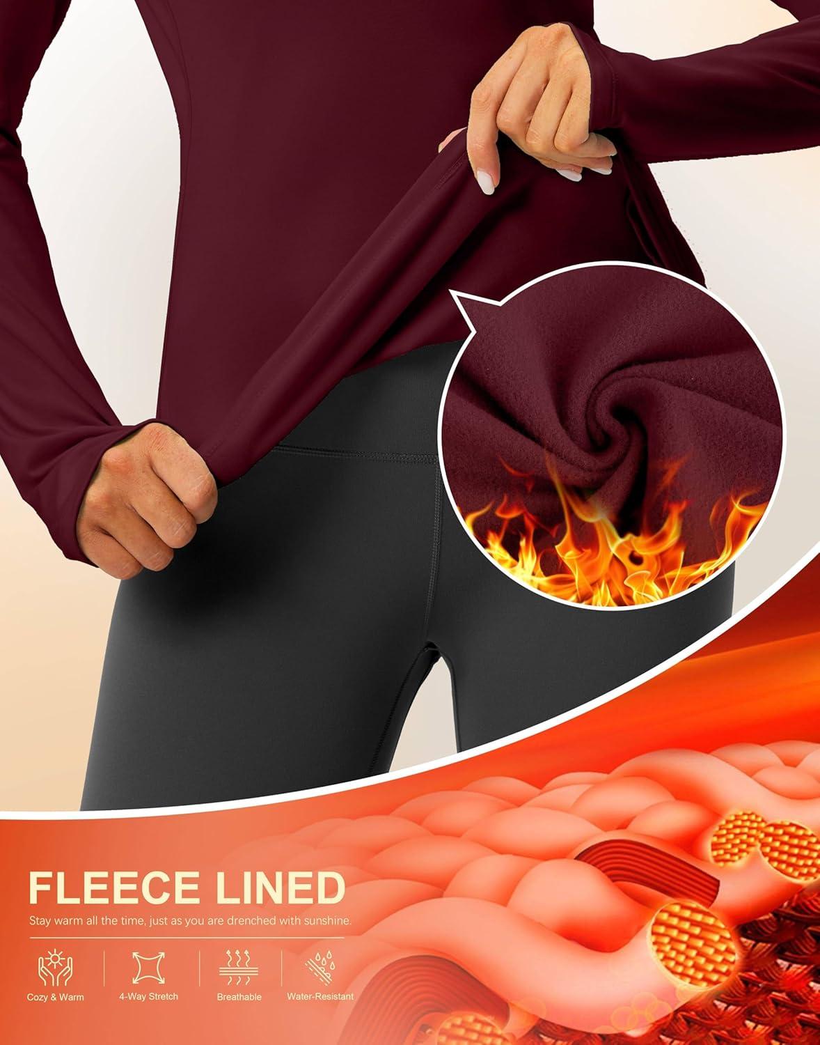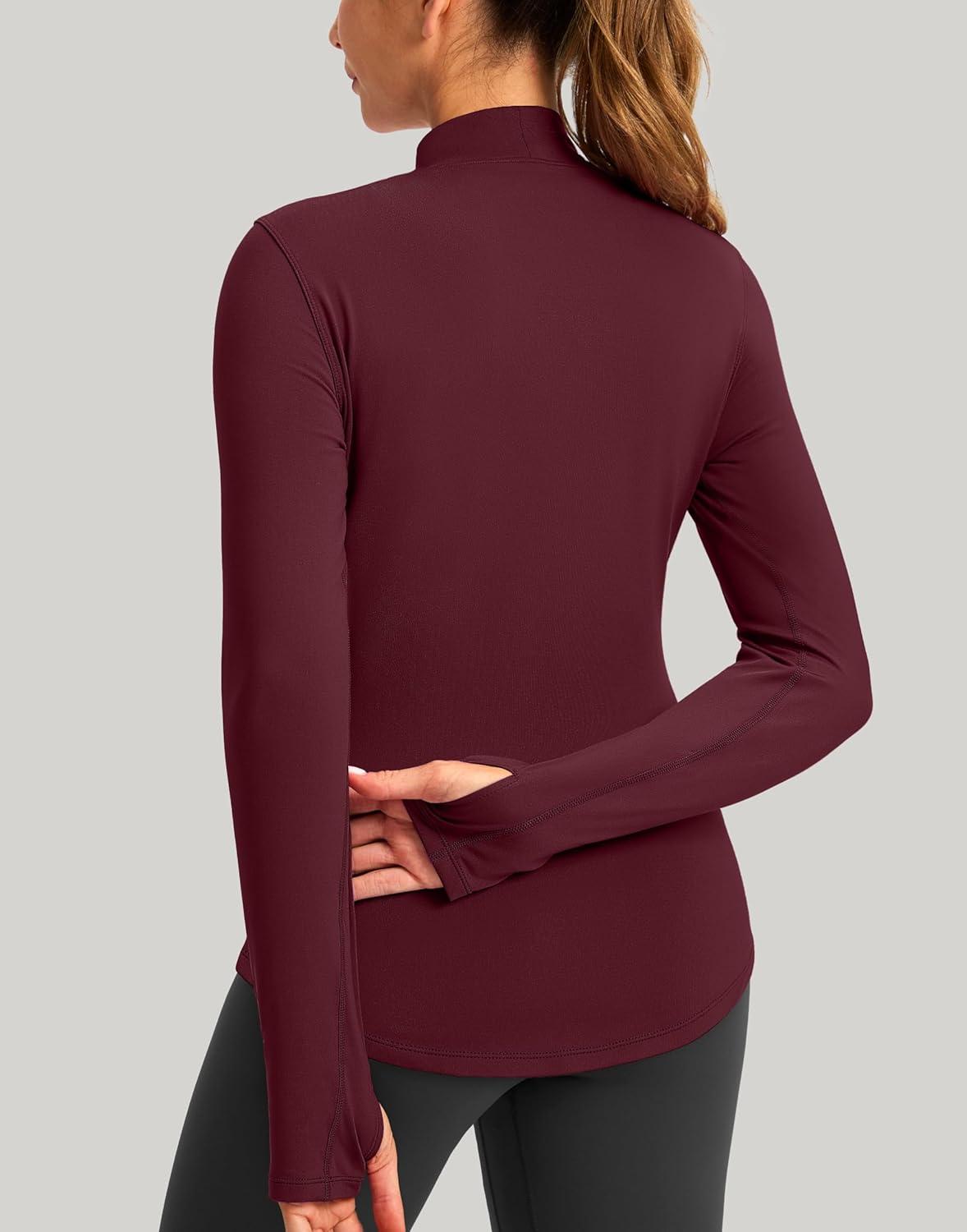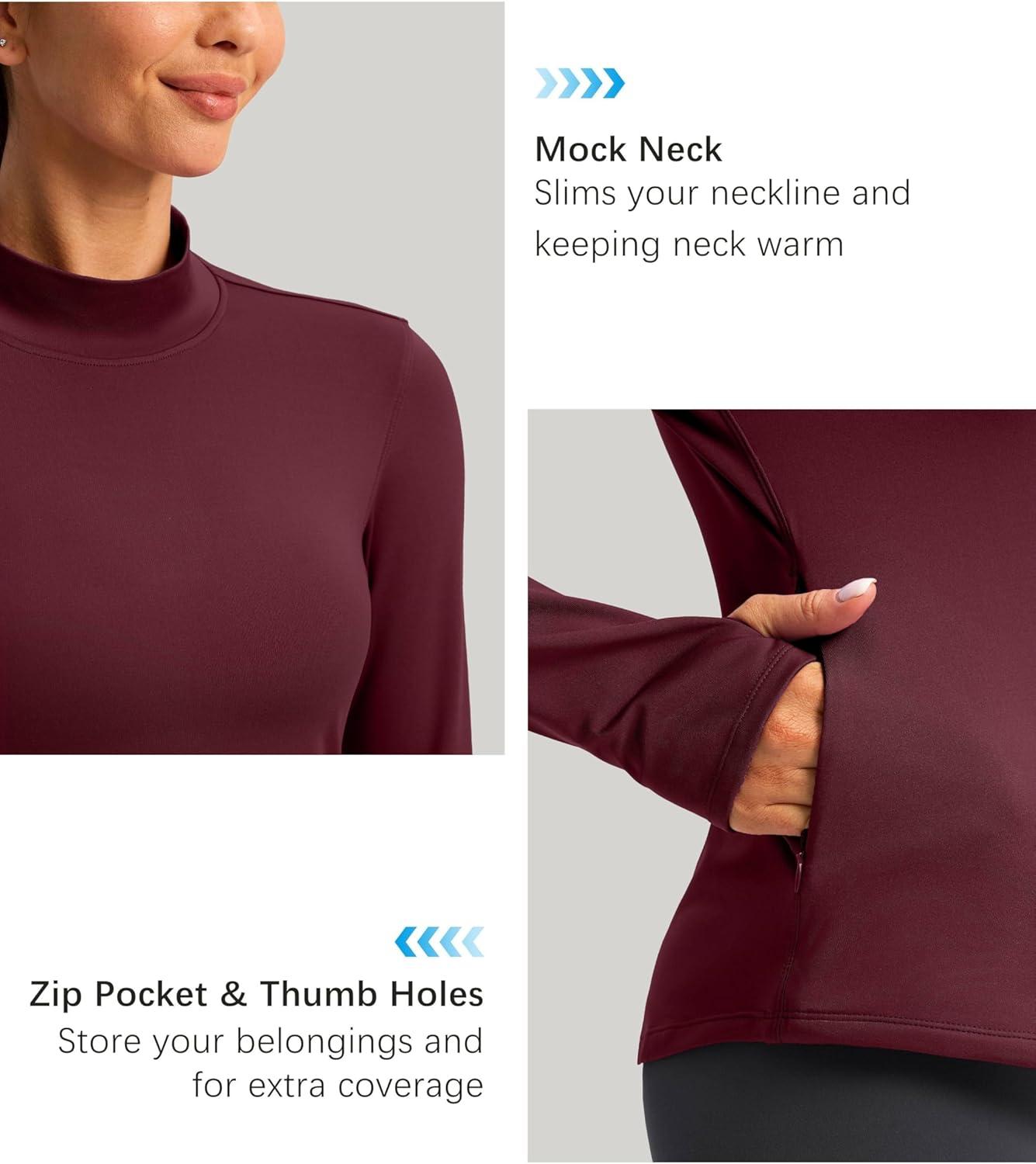 Thermal Shirts for Women Long Sleeve Mock Neck Fleece Tops Running Workout Cold Weather Gear with Zip Pocket(Wine)