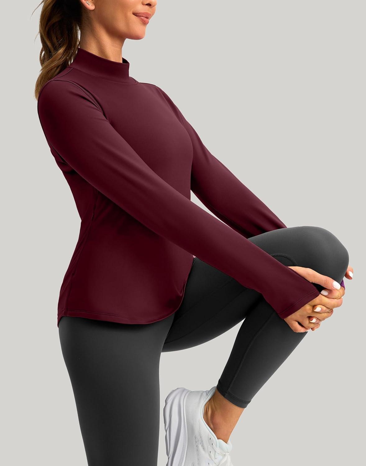 imageThermal Shirts for Women Long Sleeve Mock Neck Fleece Tops Running Workout Cold Weather Gear with Zip PocketWine