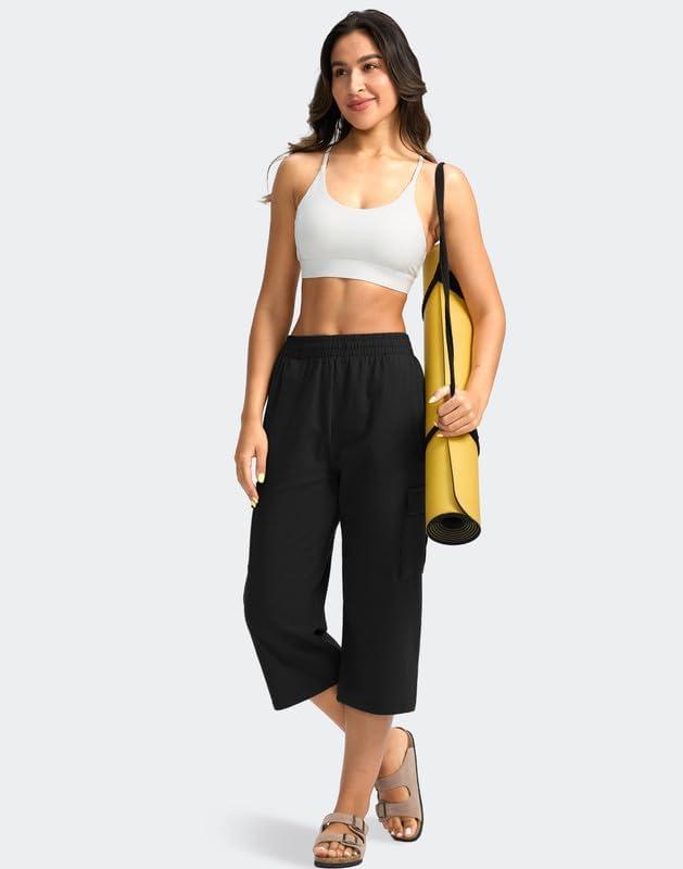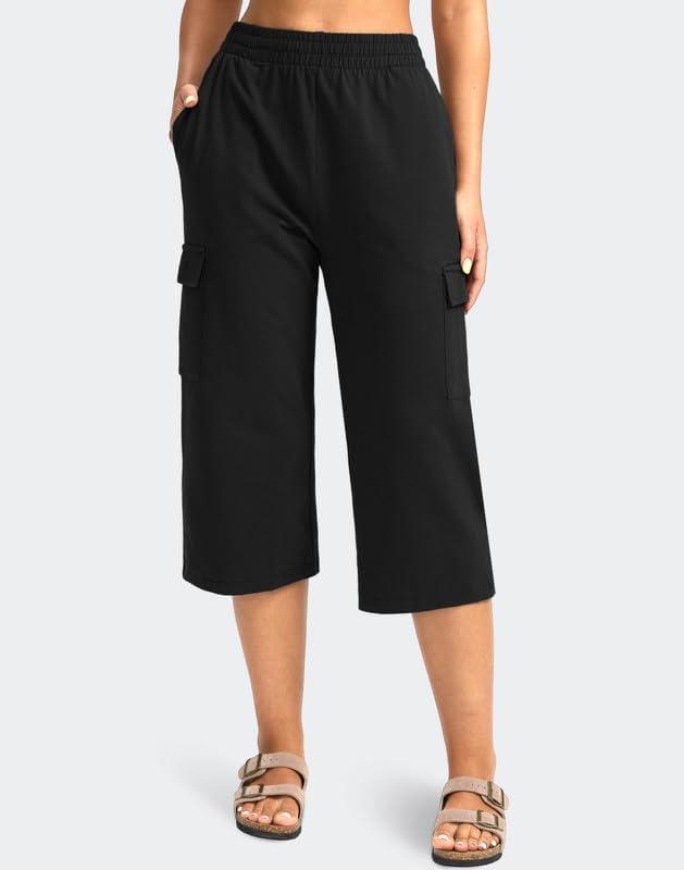 Women's Capri Pants with 4 Pockets Soft Cotton Stretch Cropped Pants Loose Cargo Capris for Women Yoga Casual(Black)