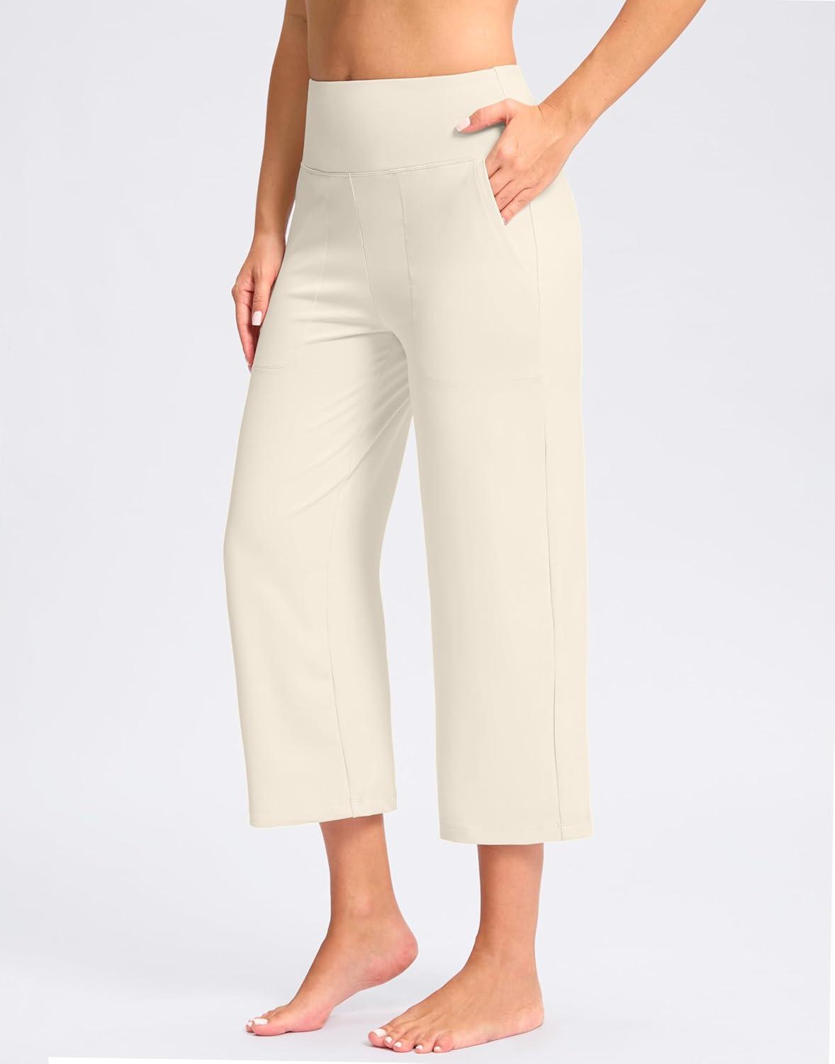 Women's Capri Pants with Pockets High Waist Yoga Pants Wide Leg Workout Crop Summer Pants for Casual, Travel, Exercise(Creamy)