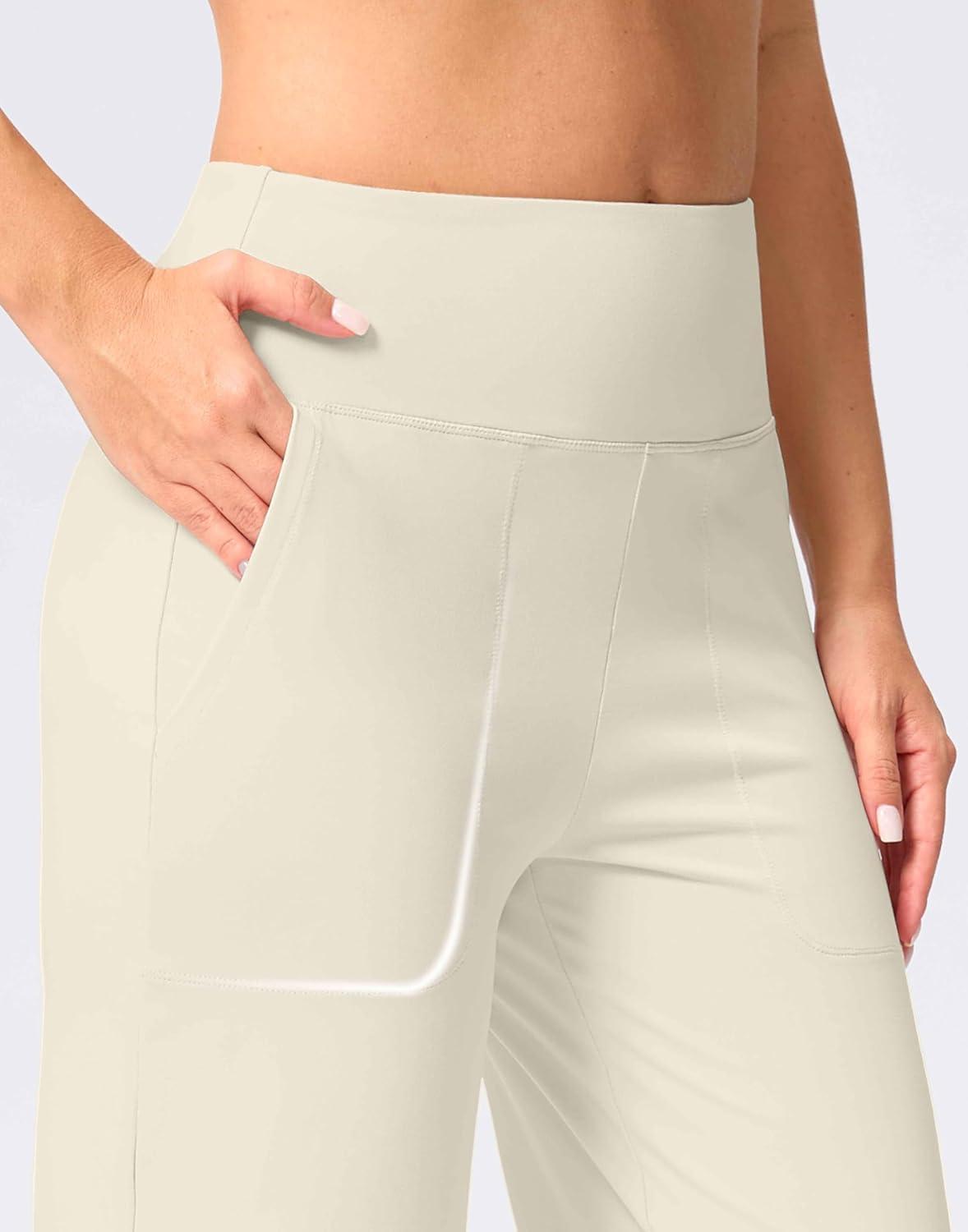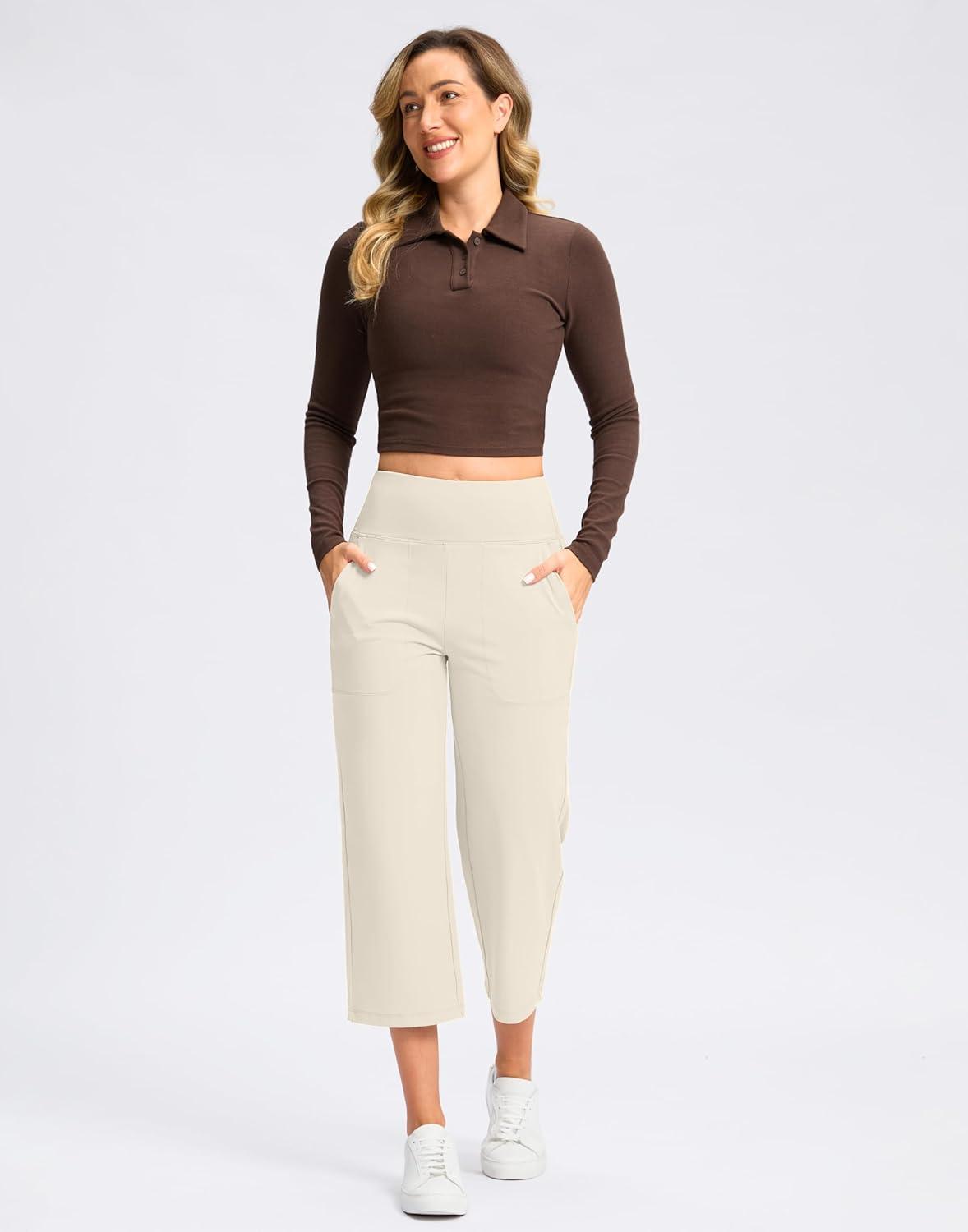 Women’s Capri Pants with Pockets High Waist Yoga Pants Wide Leg Workout Crop Summer Pants for Casual, Travel, Exercise(Creamy)