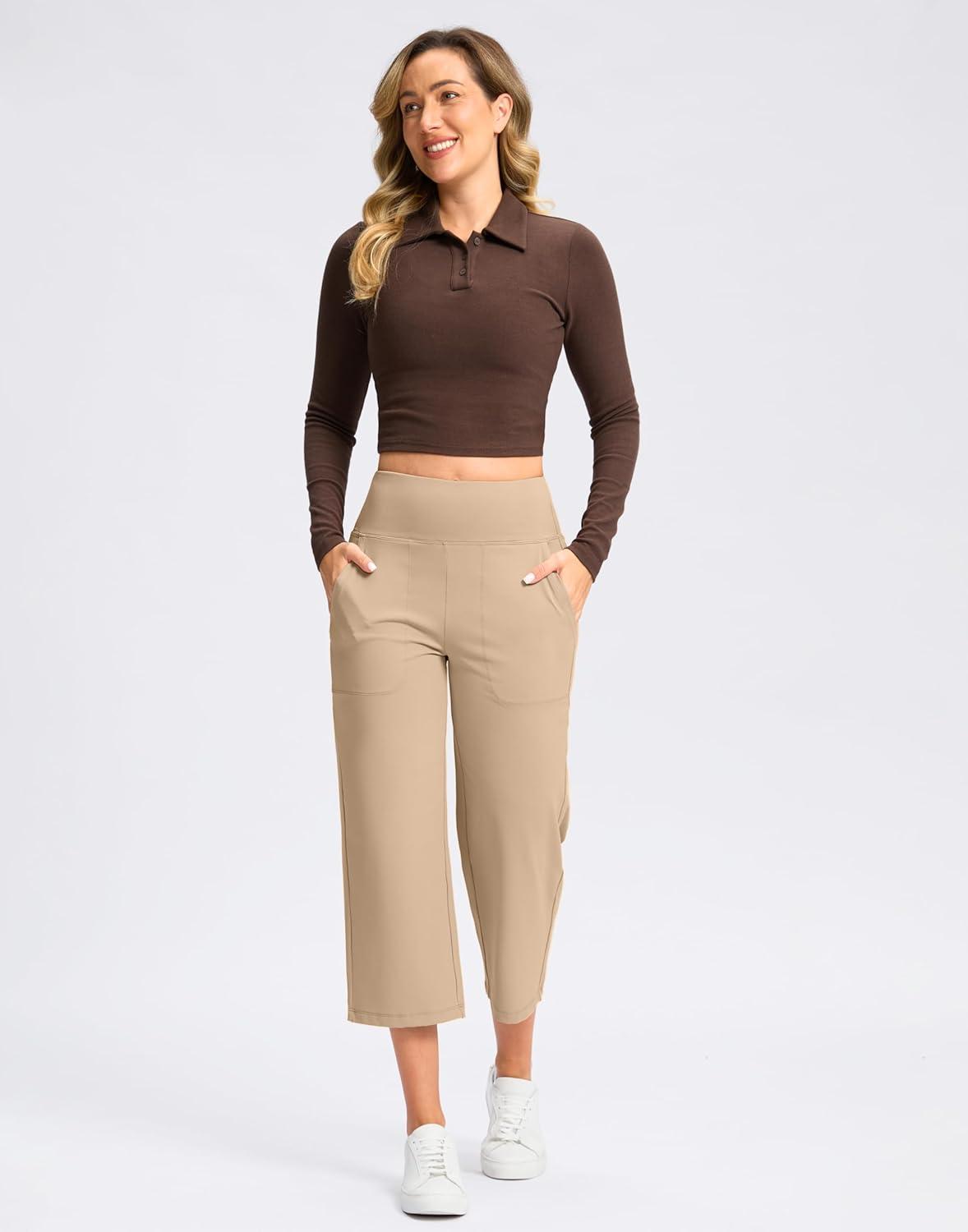 Women’s Capri Pants with Pockets High Waist Yoga Pants Wide Leg Workout Crop Summer Pants for Casual, Travel, Exercise(Khaki)
