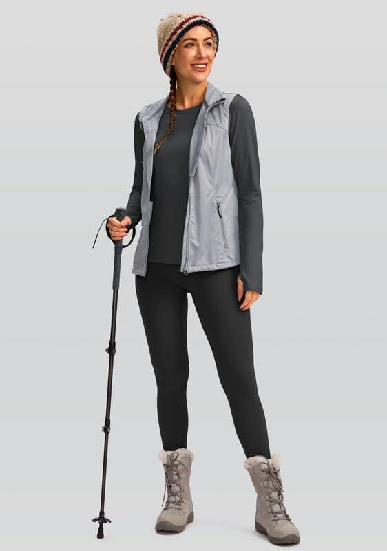 Women’s Thermal Fleece Tops Long Sleeve Workout Shirts Running Athletic Base Layer with Thumb Holes Zipper Pocket(Light Grey)