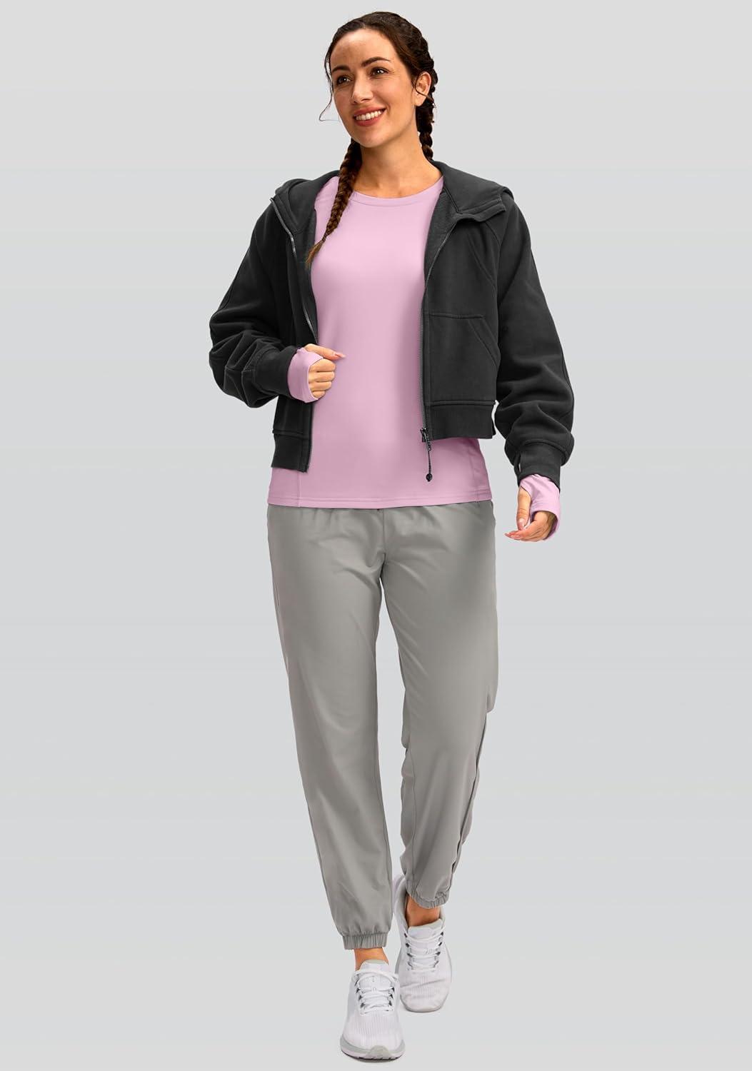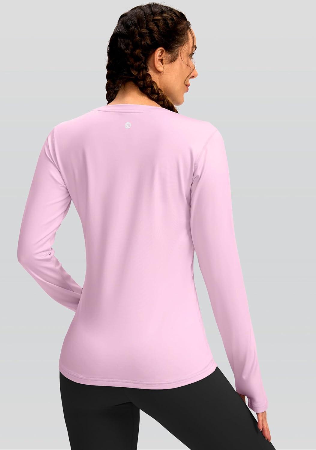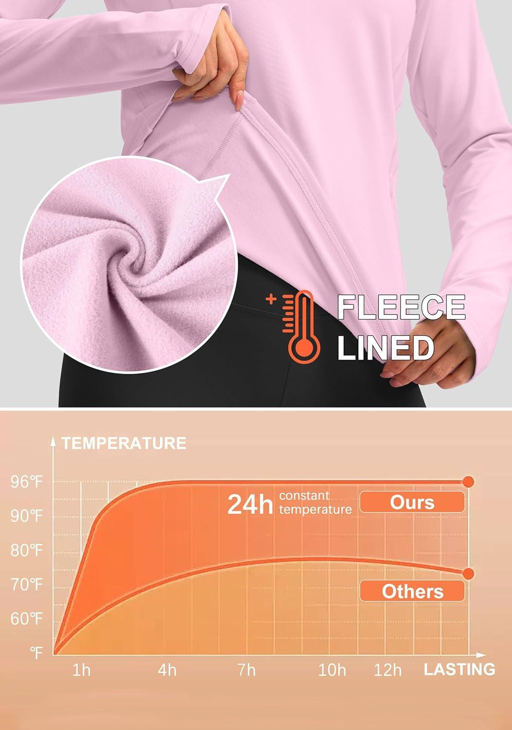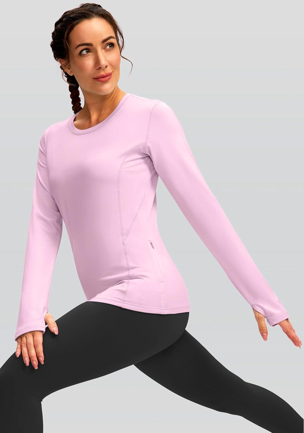 Women’s Thermal Fleece Tops Long Sleeve Workout Shirts Running Athletic Base Layer with Thumb Holes Zipper Pocket(Pink)