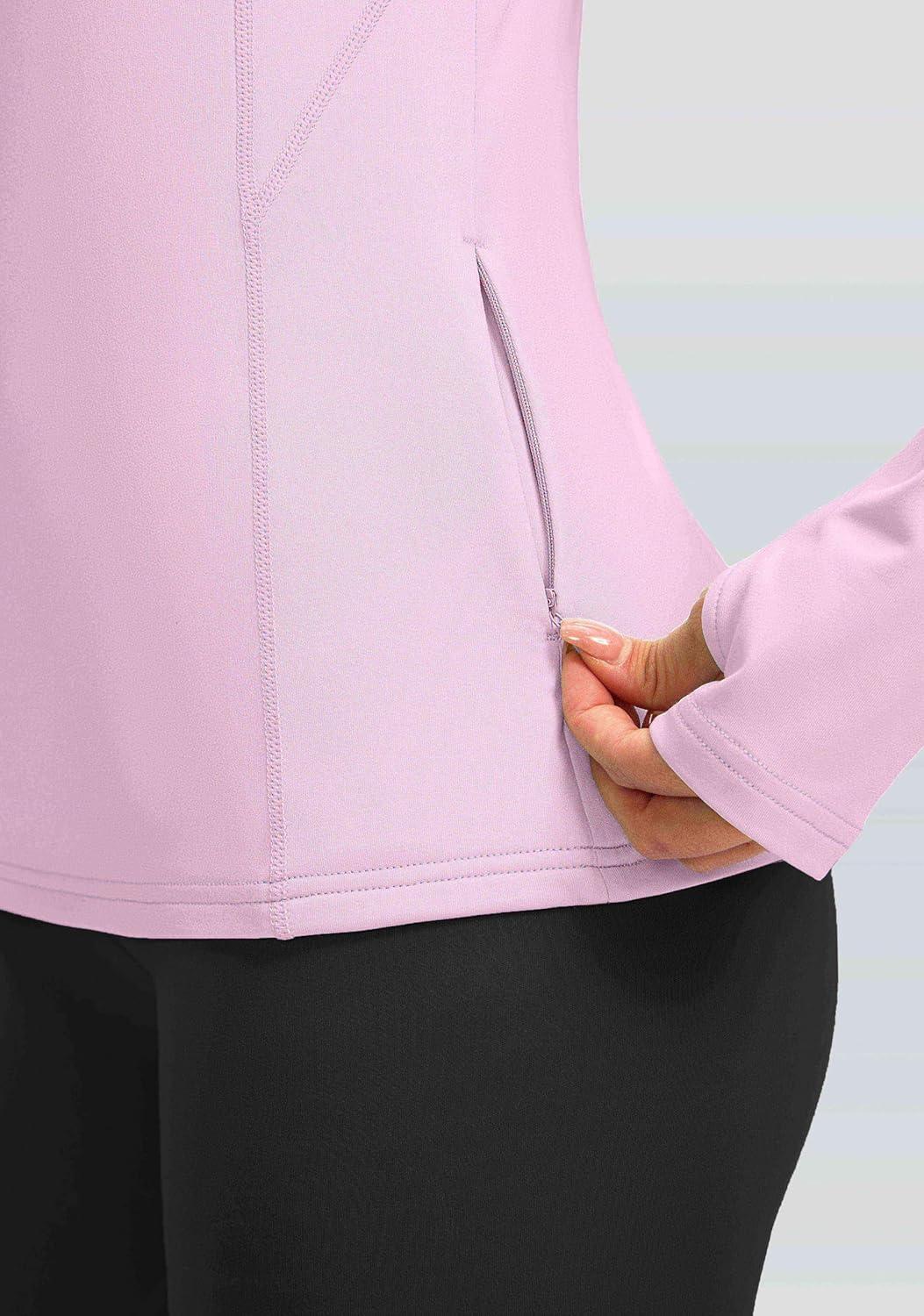 Women's Thermal Fleece Tops Long Sleeve Workout Shirts Running Athletic Base Layer with Thumb Holes Zipper Pocket(Pink)